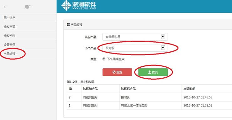 认证计费系统套餐变更为当月变更,次月生效。建议用户在10月31日24点前登录新系统自服务系统,选择左侧“用户”—“产品转移”--根据个人实际使用需求选择“下个产品”对应的上网套餐,点击“提交”进行套餐变更。