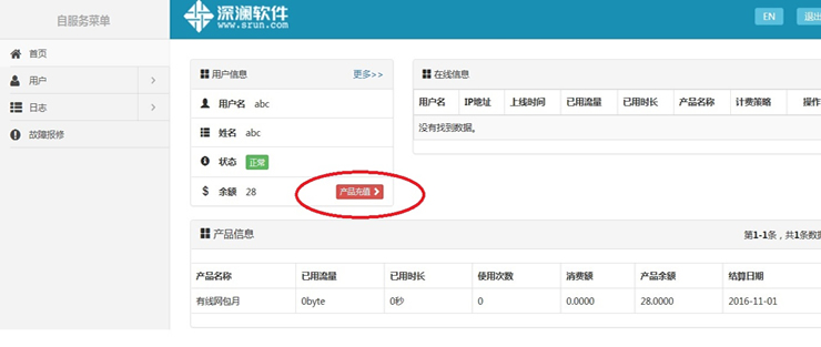与原系统不同之处为自助缴费的金额默认充值到上网账号电子钱包中,需要用户登录自服务系统后选择“产品充值”,选择当月/次月要使用的产品套餐,选择/输入充值金额,点击“提交”完成自助充值后方可正常使用网络。“产品充值”功能将于2016年10月30日开始开放。