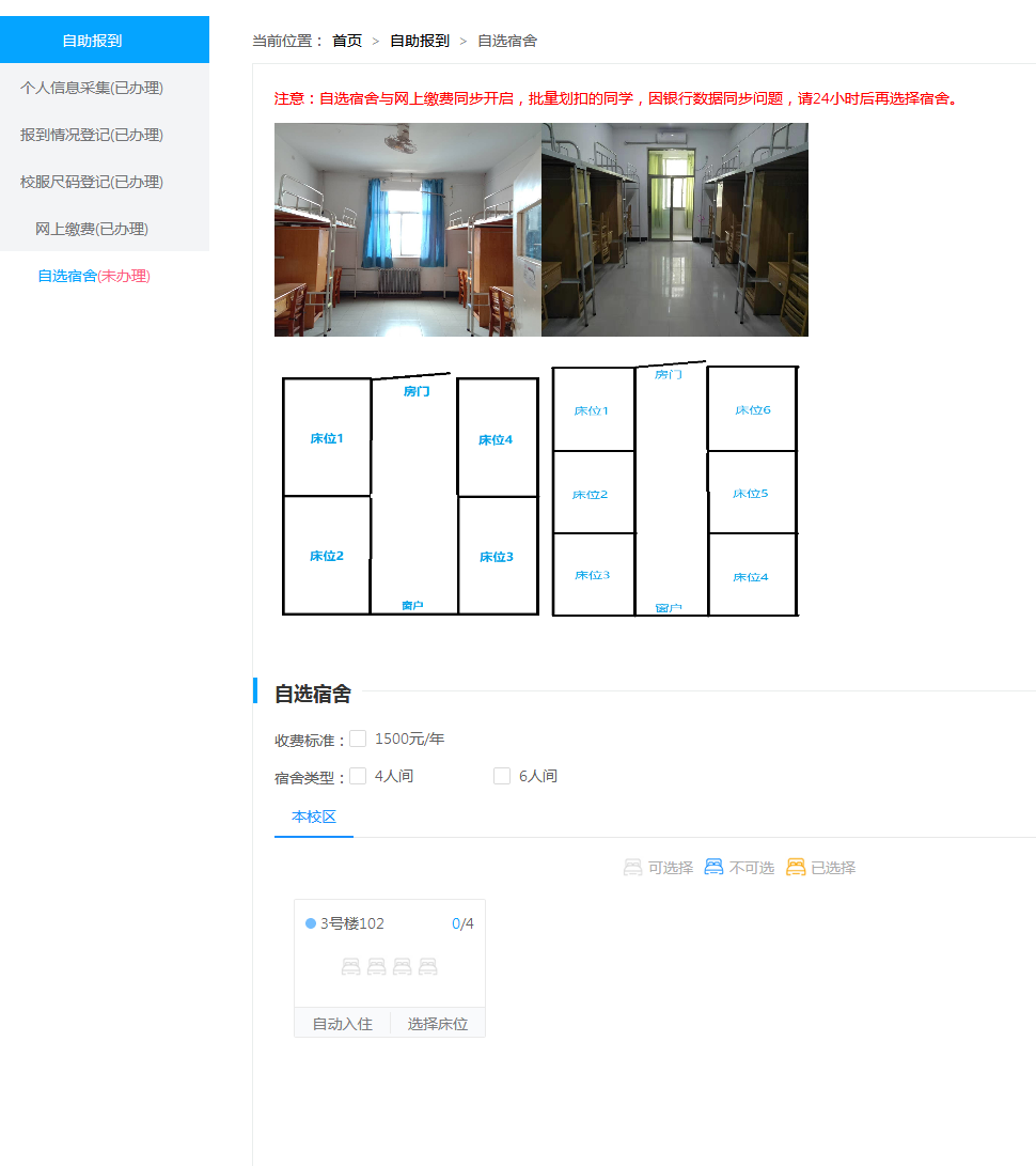 5、自选宿舍:自选宿舍与网上缴费同步开启(宿舍选完后,如有空床位可更改选择)。