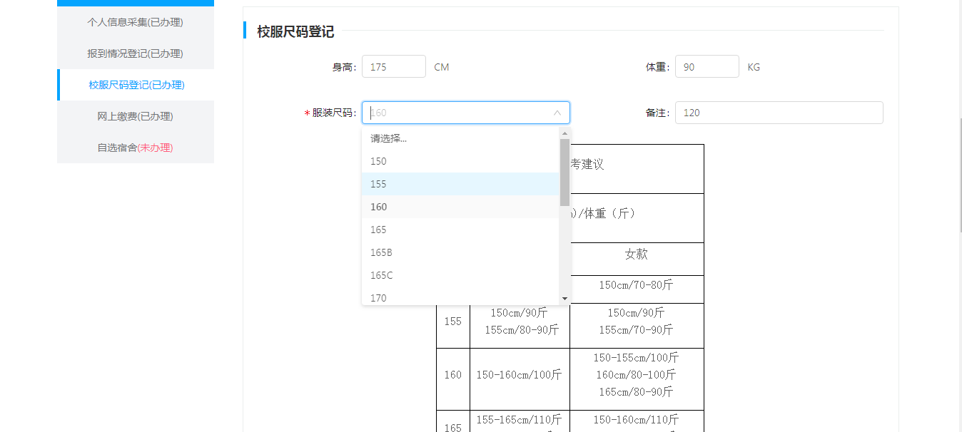 3、 校服尺码登记:参照尺码参考表填写服装尺码(校服160元/套,自愿购买)。