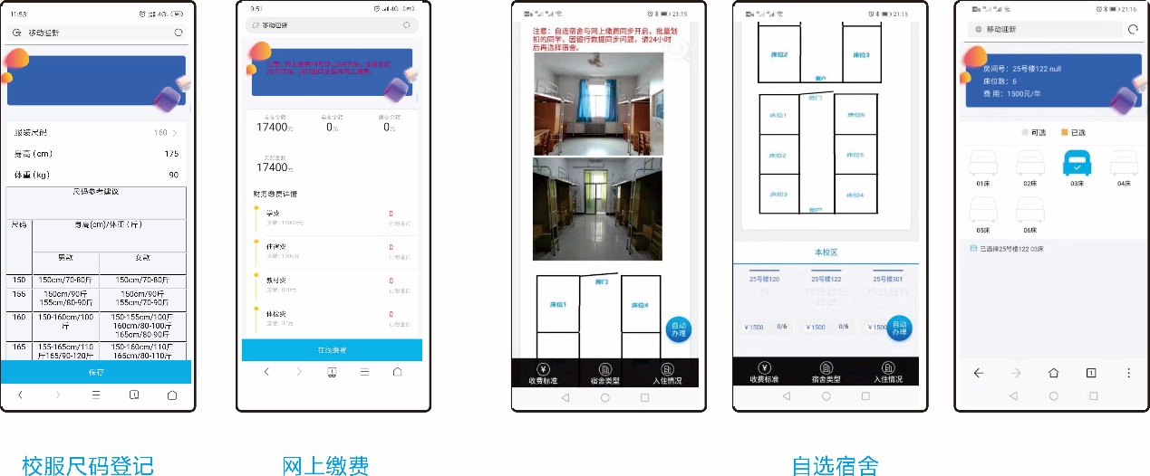 即:【个人信息采集】-【报到情况登记】-【校服尺码登记】-【网上缴费】-【自选宿舍】。