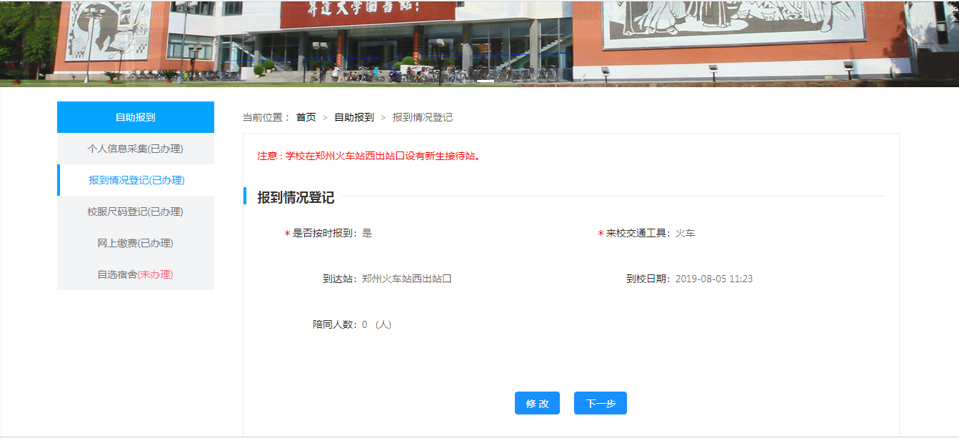 注1:自助报到环节必须依次填写,不能跳过某个环节直接进行下一个环节;网上自助报到流程完成以后,根据录取通知书上的报到时间按时入学。