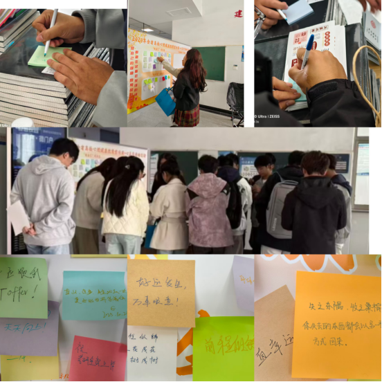活动现场,原本空白的展板被五彩的便签和充满创意的简笔画逐渐填满。在“致自己”成长区,有同学写下“考研必胜!”的坚定目标,也有“每天都要更快乐一点”的简单愿望;在“致同窗”温暖区,那些平时未曾说出口的“谢谢你”和“和你做朋友很开心”,成为了连接彼此情感的纽带;“校园微光”发现区记录下了无数被忽略的美好瞬间:“图书馆窗边的阳光正好”、“食堂阿姨多给了一勺菜”,这些微小而确切的幸福,引发了众多同学的共鸣;而“新生指南”限定区则汇聚了学长学姐们的宝贵经验,从学习到生活,一字一句都是对新生最实用的关怀。