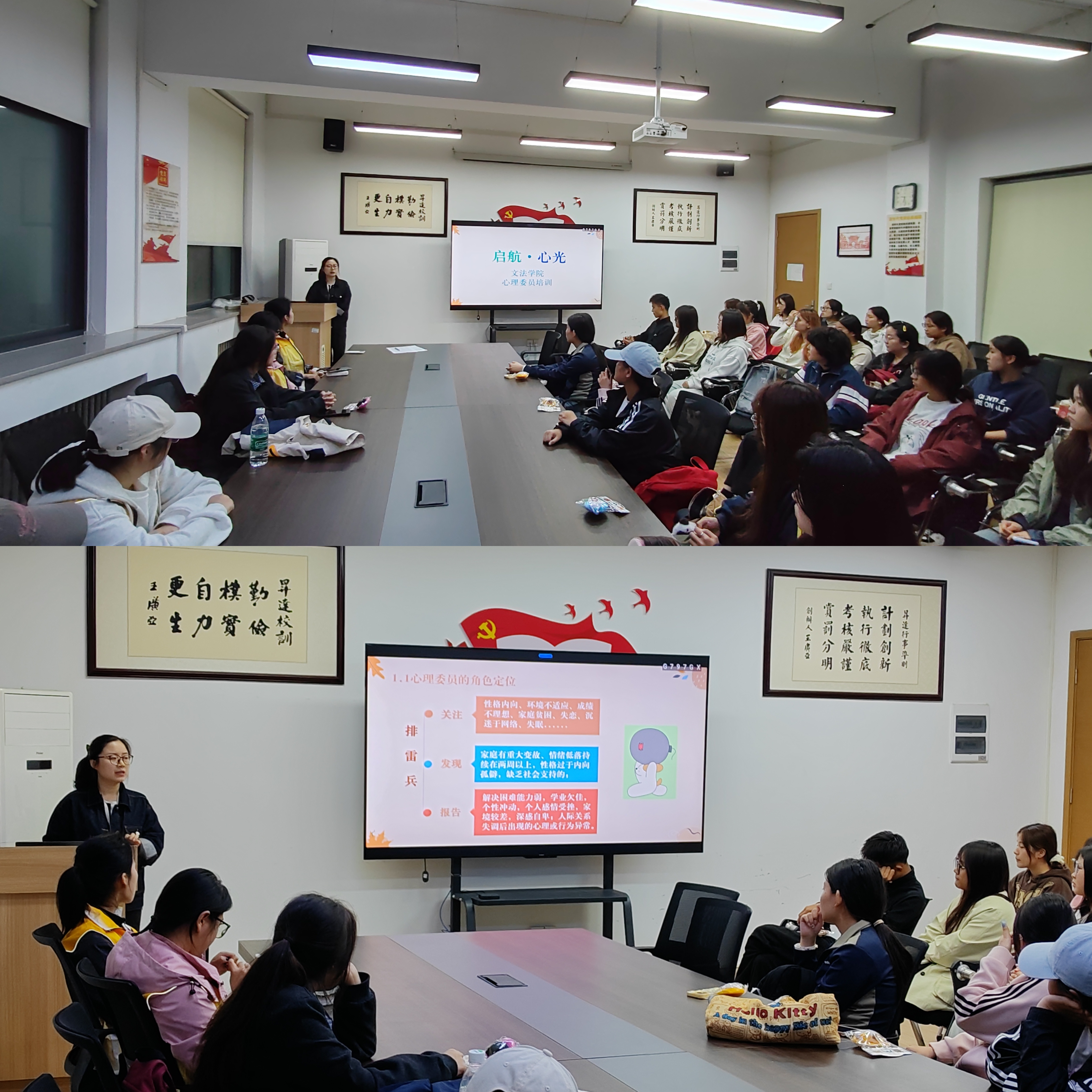 为切实提升文法学院新生心理委员的履职能力,筑牢学院心理健康服务“第一道防线”,10月16日晚,文法学院“启航·心光”心理委员培训会议在教学1号楼314会议室顺利召开。本次会议由学院心理专员周洁老师主讲,文法学院全体新生心理委员参与。