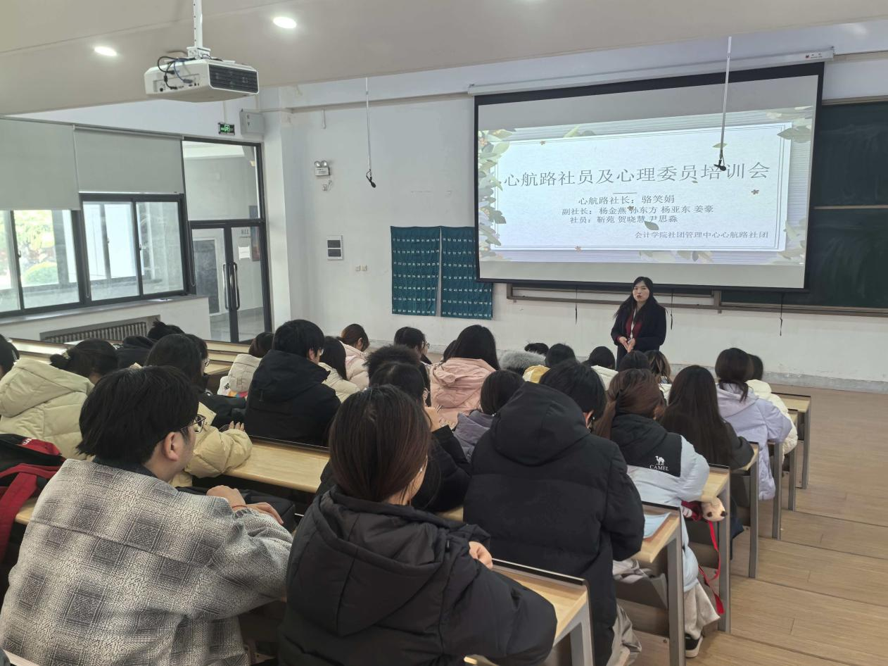 为切实加强2025级新生心理健康教育工作,充分发挥班级心理委员在心理健康预警与疏导中的“第一道防线”作用,帮助新生更快适应大学生活,10月13日,会计学院在教学4号楼118教室举行2025级新生班级心理委员专题培训。会计学院心理辅导站副站长赵鑫鑫老师及全体2025级新生班级心理委员参加本次培训,培训由新航路社团社长骆笑娟主持。