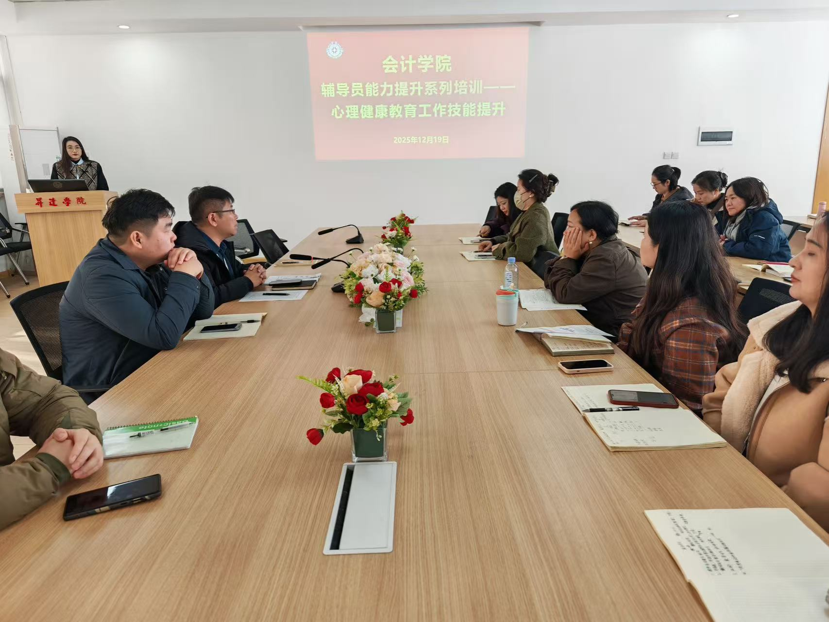 12月19日上午10:30,会计学院在教学四号楼209会议室举办了一场聚焦“辅导员能力提升系列培训——心理健康教育工作技能提升”的专题培训,胡淑娟老师结合前期赴哈尔滨参加“高校辅导员(班主任)核心素养与谈心谈话能力提升专题培训”的学习内容,对谈心谈话的方法技巧、心理健康教育工作的核心要点展开了系统讲解。