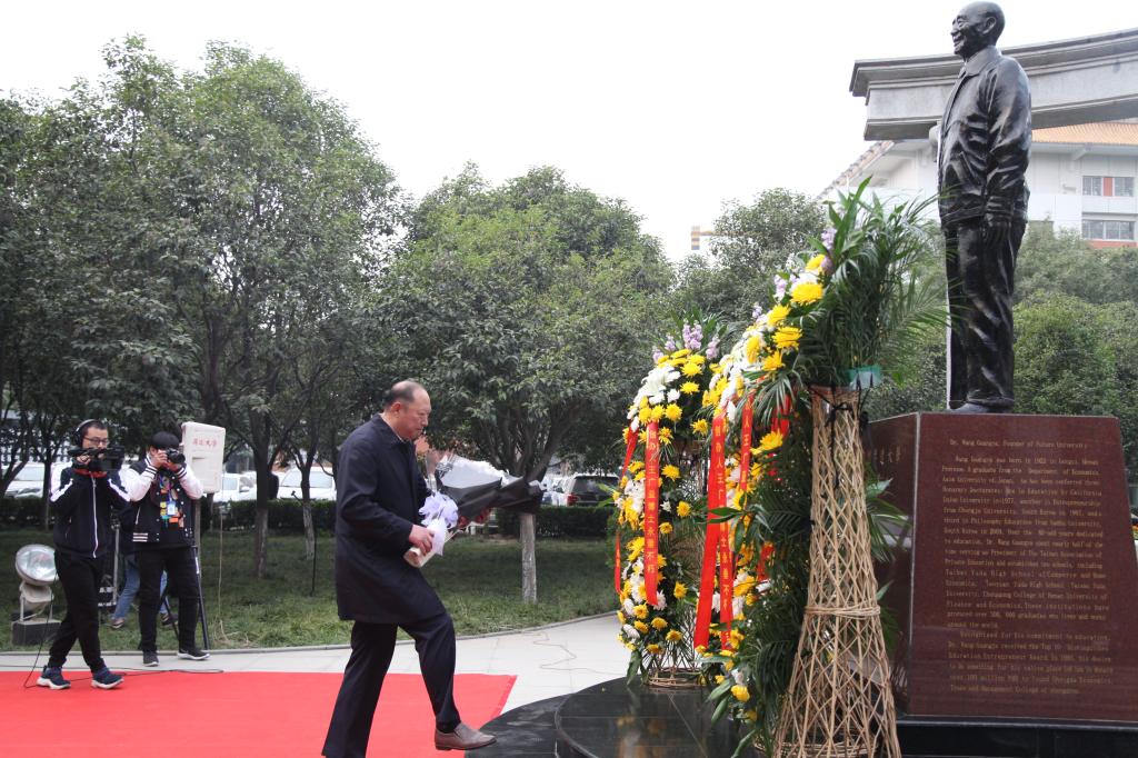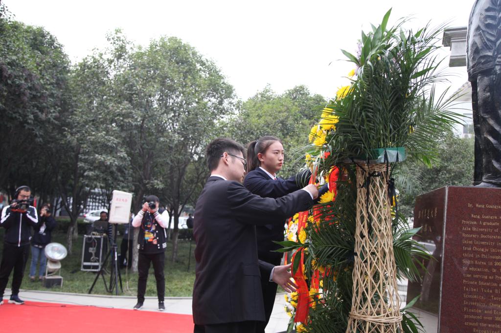 大家怀着万分崇敬的心情,手持白色与黄色的菊花恭恭敬敬、整整齐齐来到现场,缅怀创办人。创办人王广亚博士一生致力于教育事业,在海峡两岸创办学校十余所,培养学子百余万,为两岸文化教育交流鞠躬尽瘁,为民族的民办教育发展做出了卓越贡献。创办人王广亚博士的教育思想和办学理念是学校的灵魂,今天,我们缅怀尊敬的创办人,就是要牢记创办人的教诲,认真践行创办人办学理念,深化教育教学改革,提高人才培养能力,推进学校工作再上新台阶,为地方经济社会发展做出更大的贡献。
