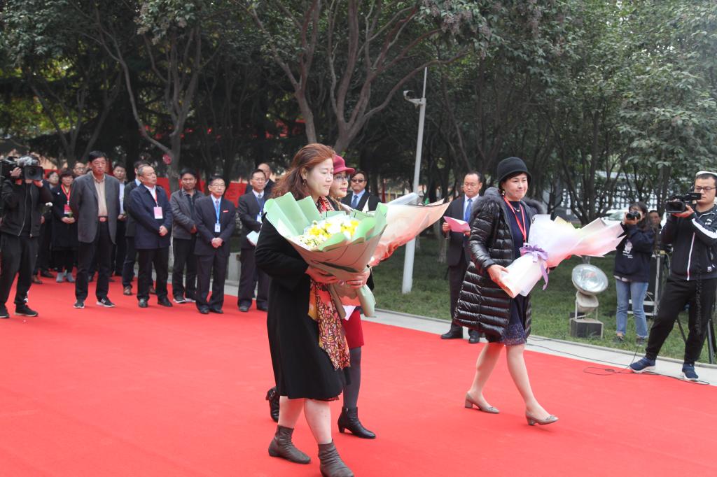 贵宾代表、韩国普宝斯(中国)董事长张画晶女士,韩国友井木面廊总经理金善子女士,韩国汉字文化研究院院长崔永和女士向创办人敬献鲜花;