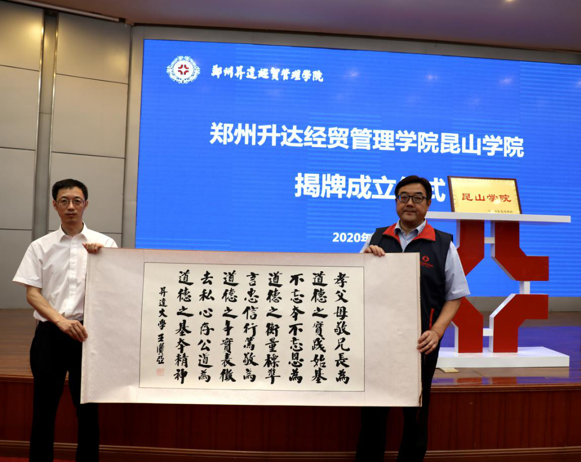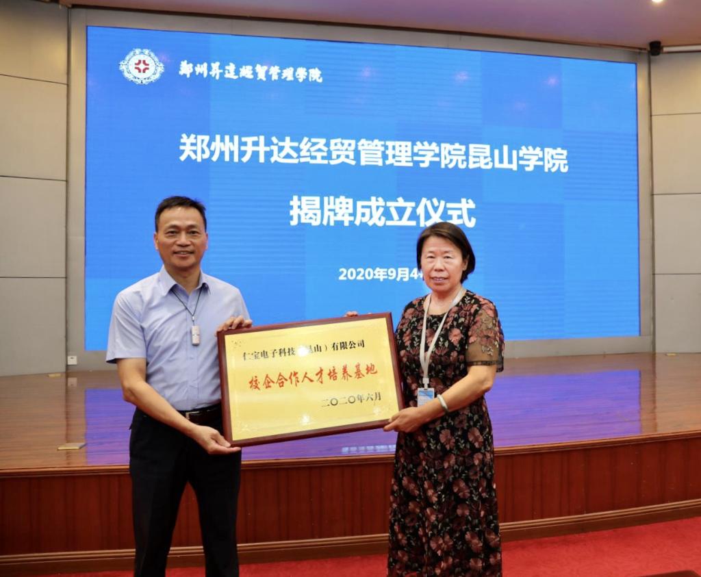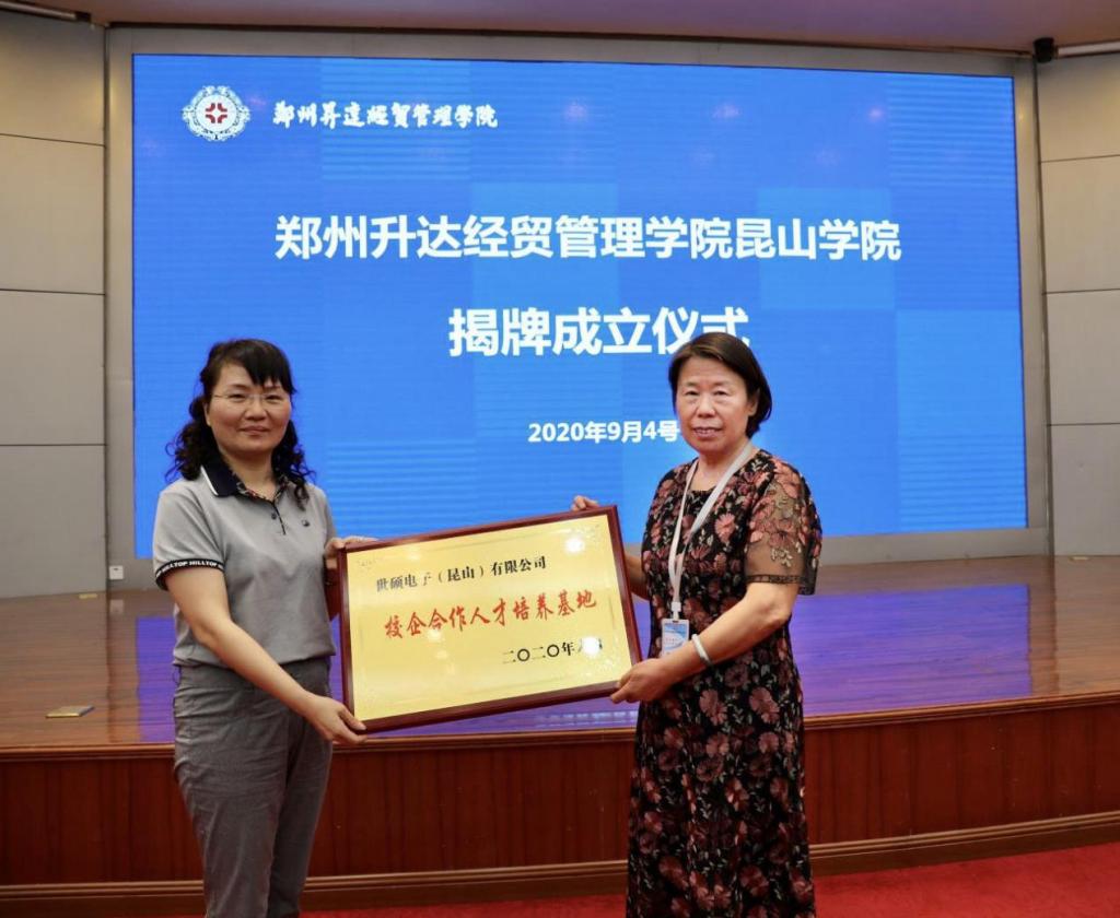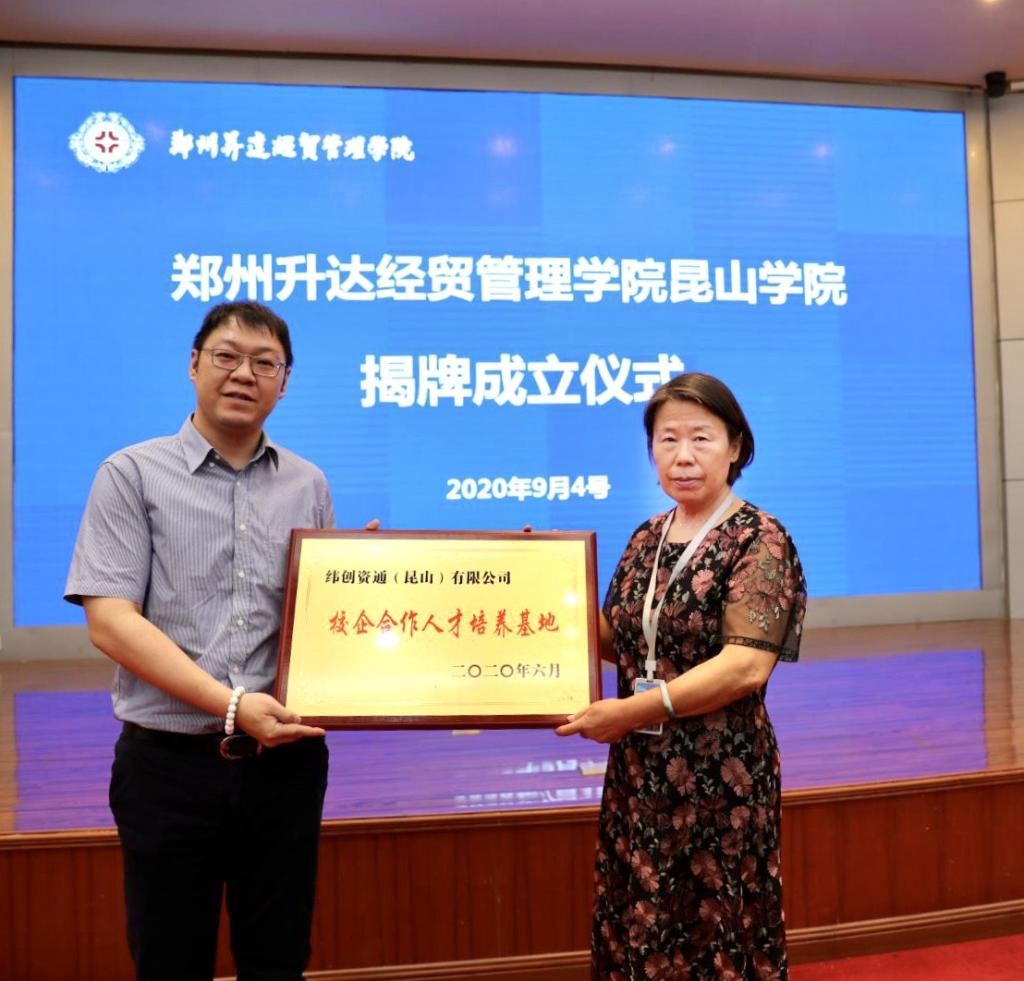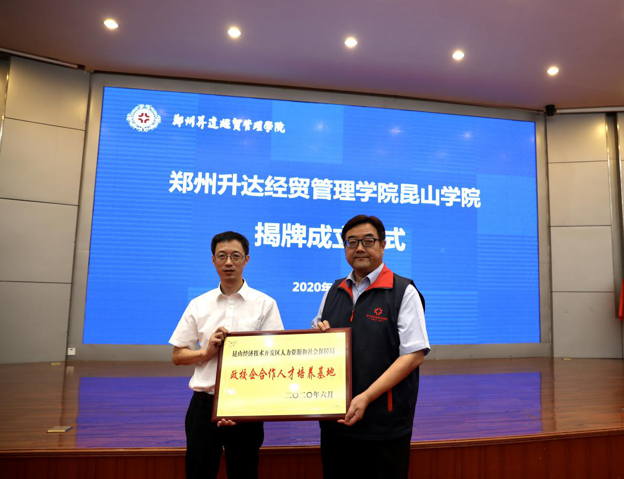昆山经济开发区人社局局长陈国平向我校执行董事王新奇博士授“政校企合作人才培养基地”牌匾。