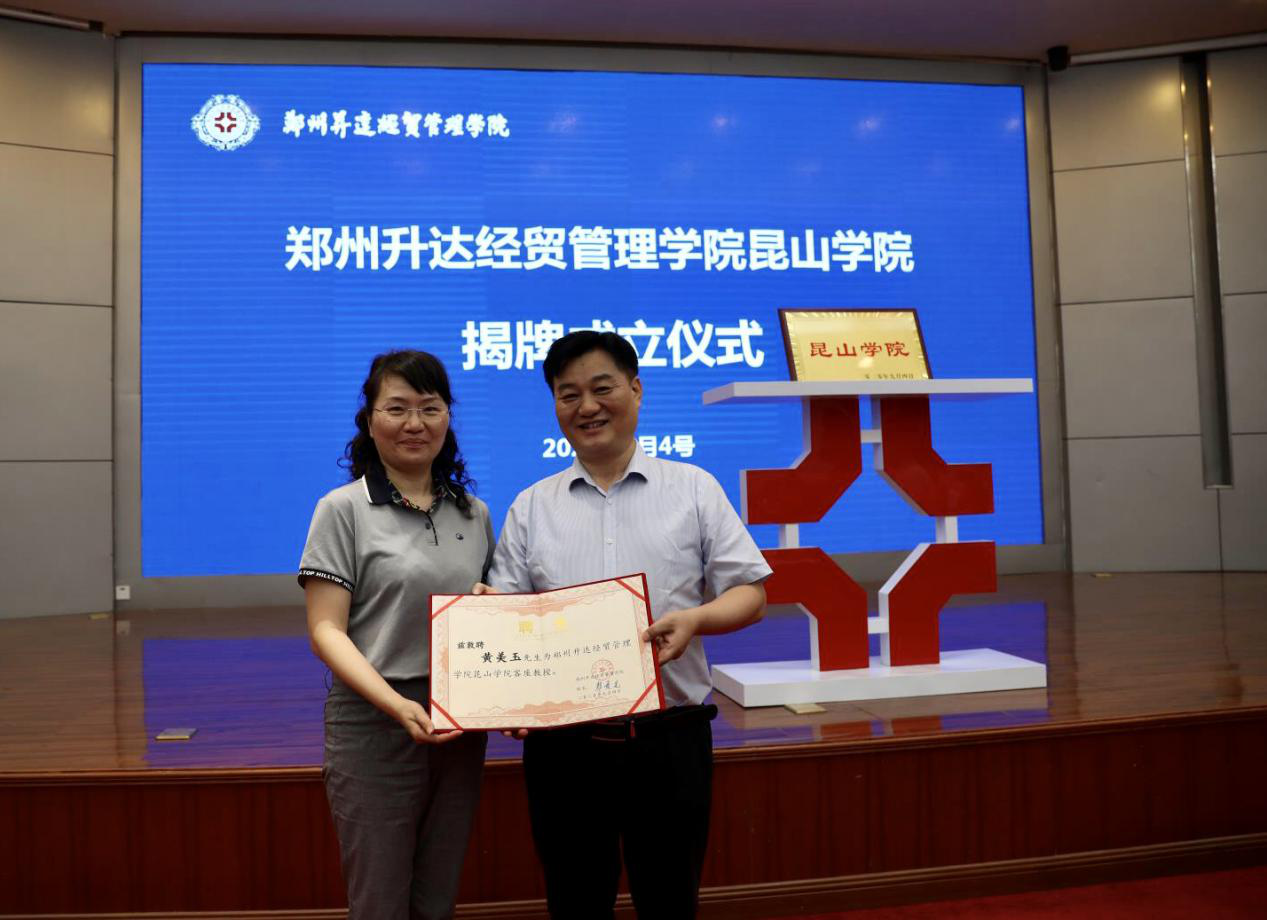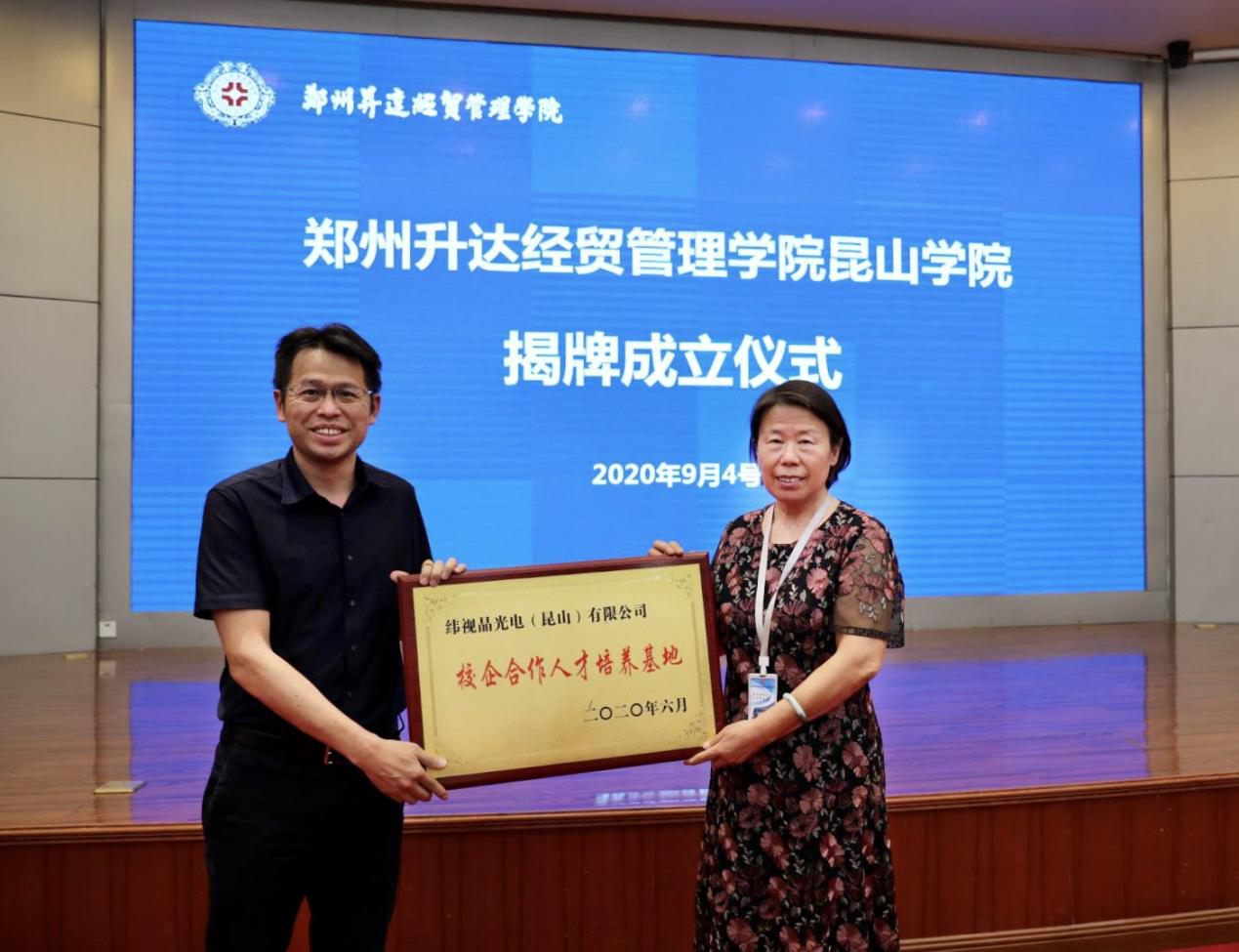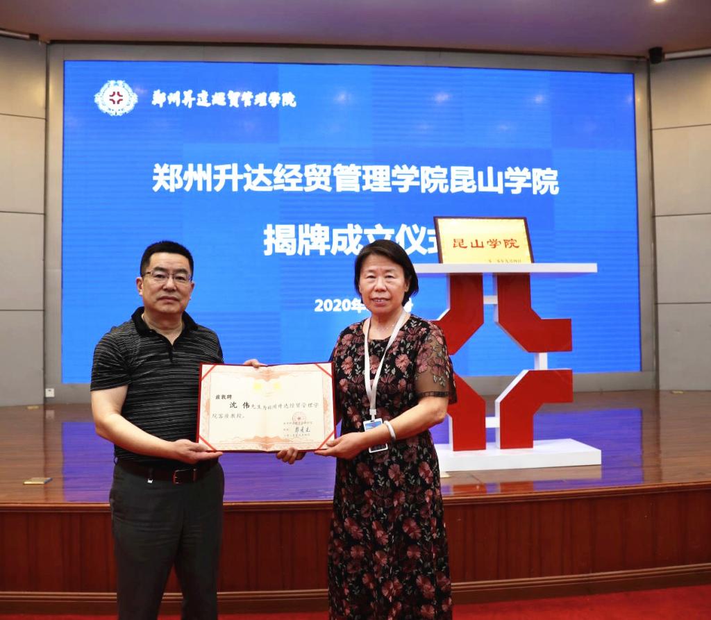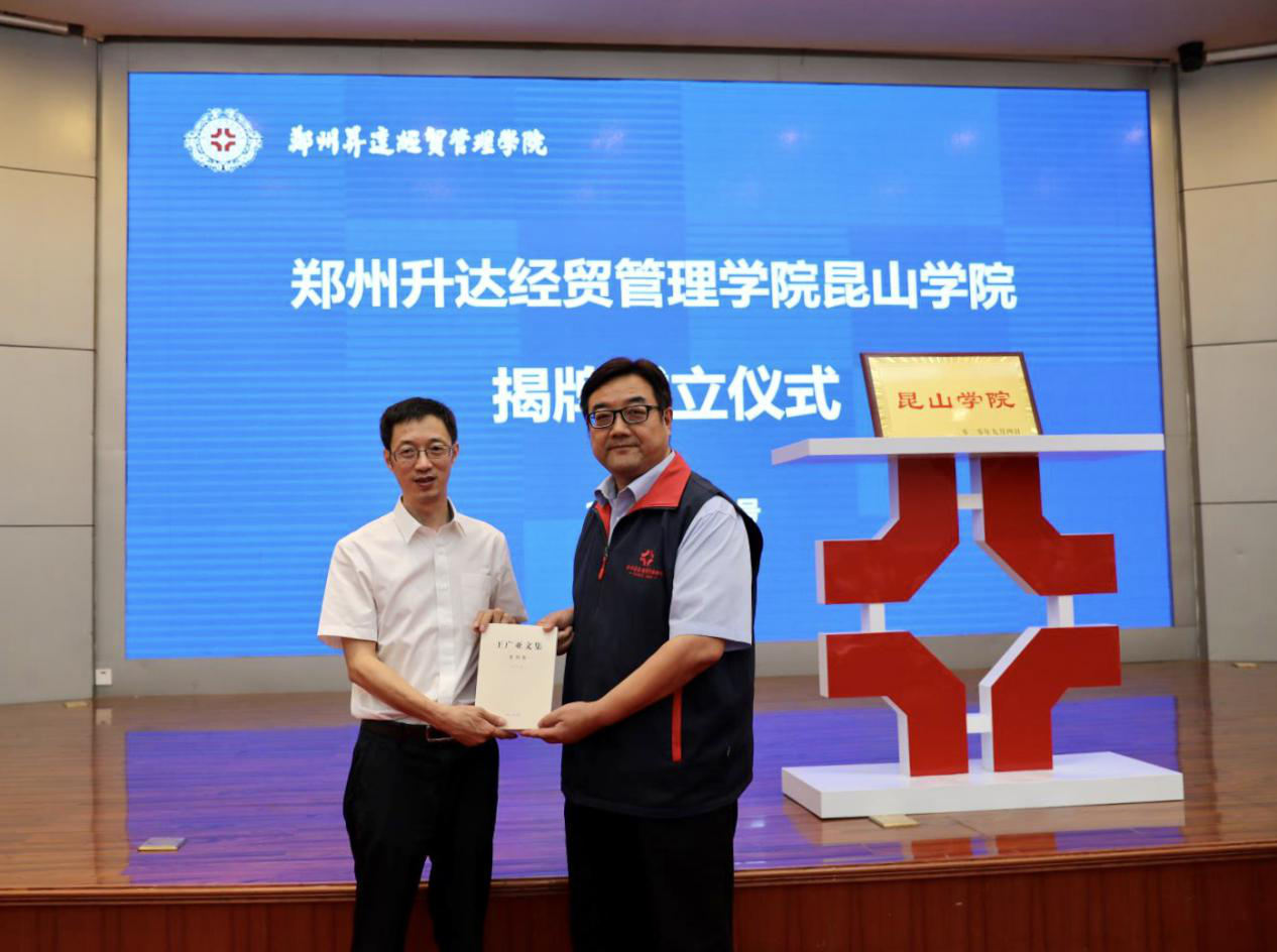 昆山经济开发区人社局局长陈国平向我校执行董事王新奇博士授“政校企合作人才培养基地”牌匾。