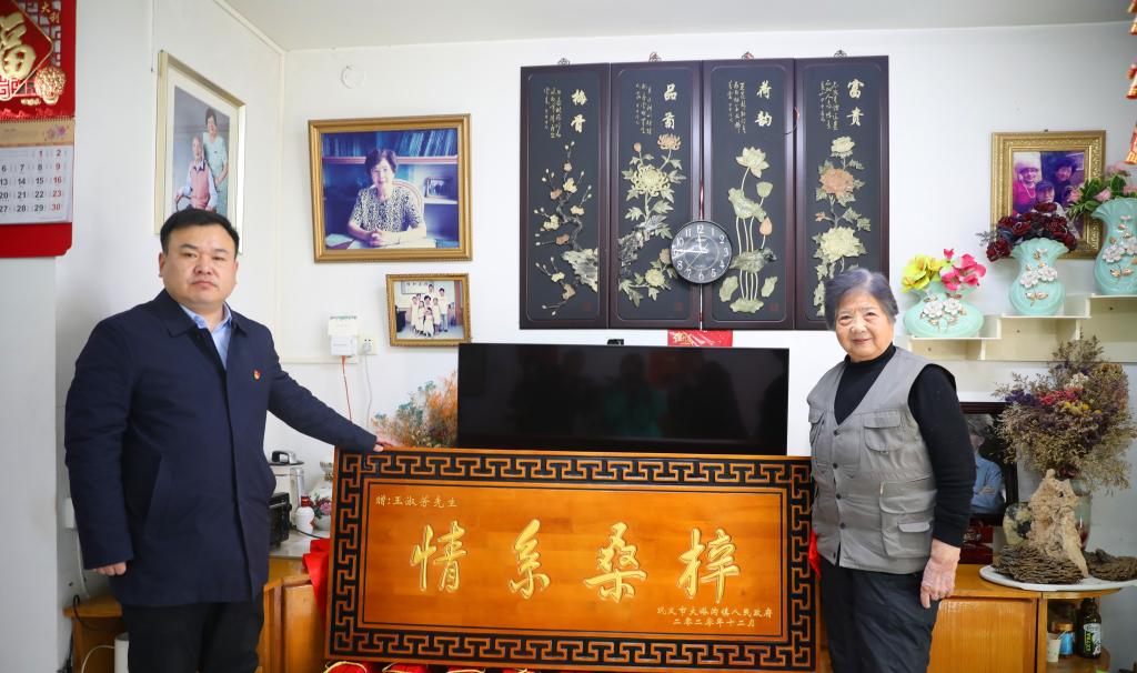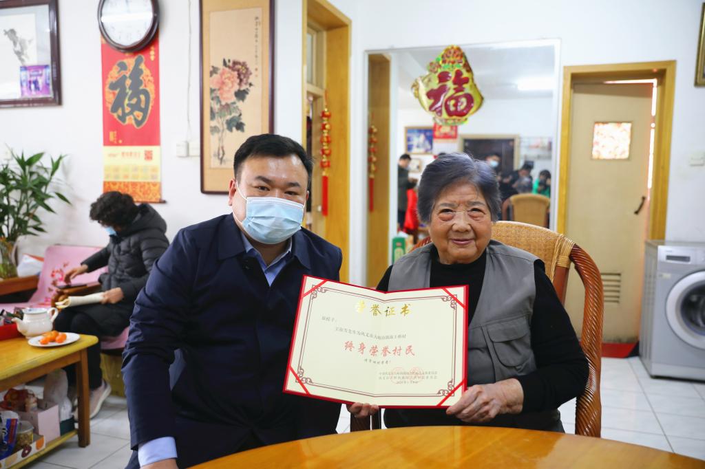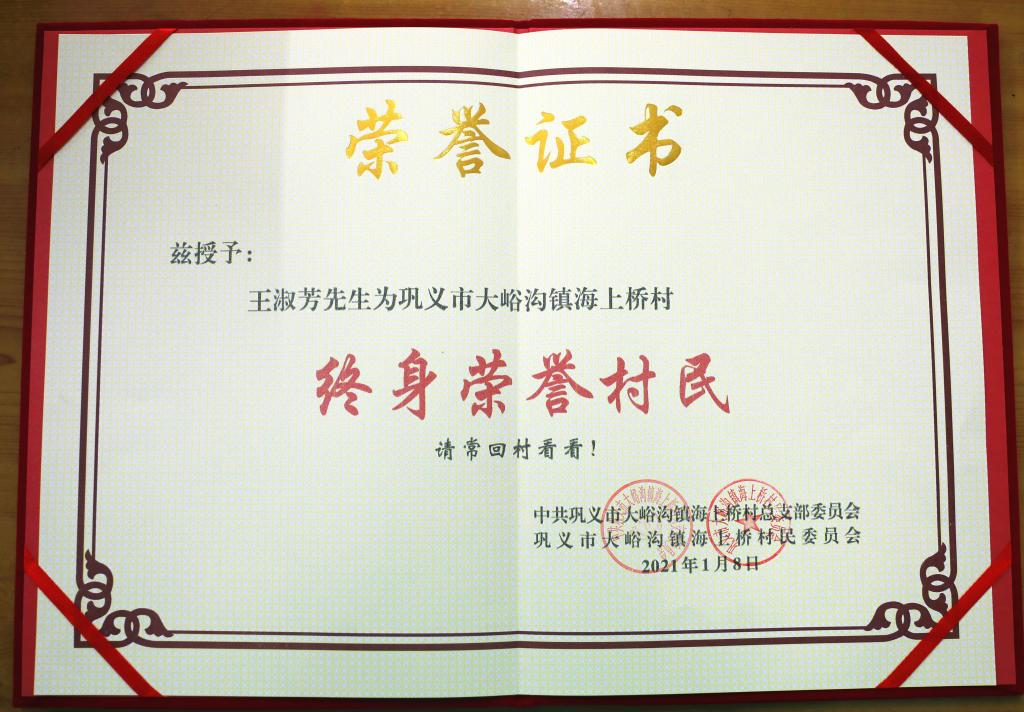 于晓理镇长说,他是受大峪沟镇党委和政府的委托,一是临近春节,专程来看望董事长给董事长拜个早年,二是代表大峪沟镇党委和政府来颁授证书和匾额。他说这幅匾额也代表着全镇的父老乡亲的一片深情厚谊;感谢创办人和董事长父女多年来对家乡父老乡亲所做的一切贡献。与于晓理镇长一同前来的还有海上桥村党支部书记,他把两张写有“终身荣誉村民”的证书,送到了董事长王淑芳和执行董事王新奇的手里,他说这张证书代表着海上桥全村人的感恩之情。