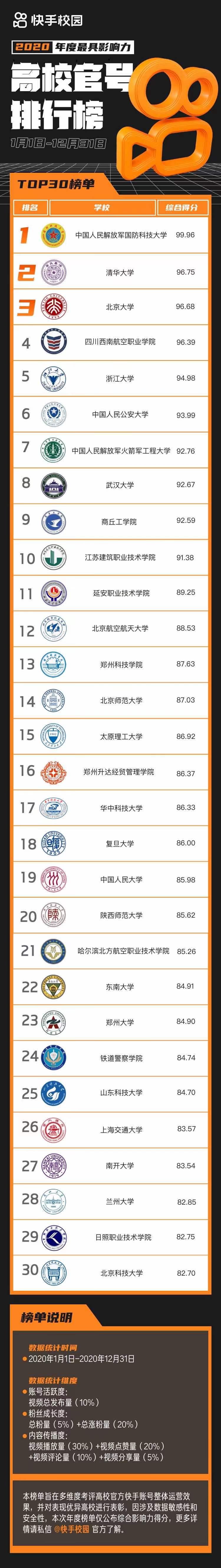 1月15日,快手校园2020年度全国高校官方账号年度最具影响力榜单公布。华亿体育登录官方快手账号,与国防科大、清华、北大等高校“同框”,排名全国高校第16位。