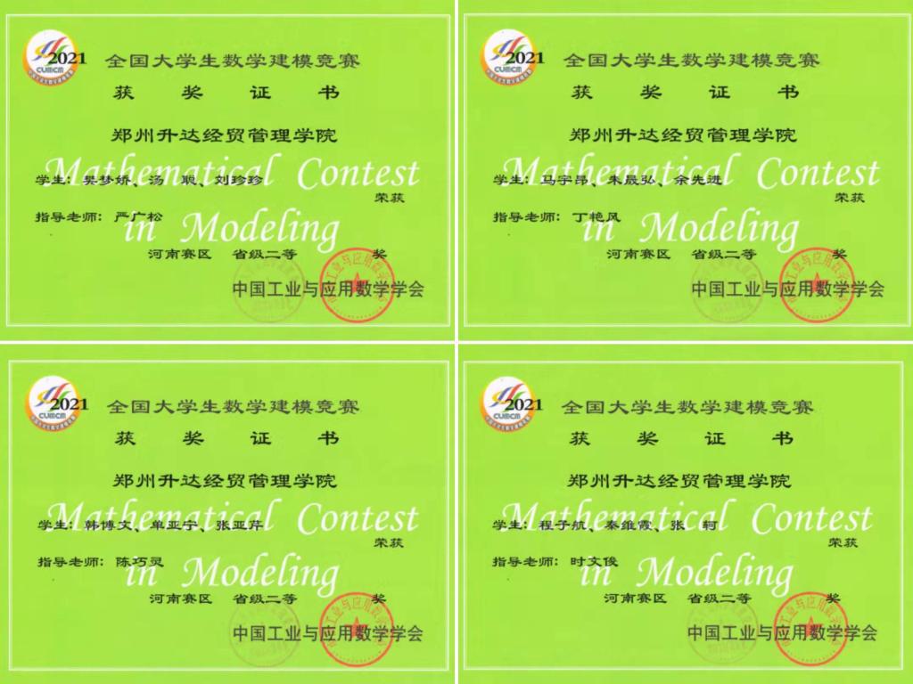 近日,2021年全国大学生数学建模竞赛成绩揭晓,我校共组织35支队伍参赛,其中29支队伍获奖,分别获得河南省赛区“省级一等奖”6组,“省级二等奖”8组,“省级三等奖”15组。