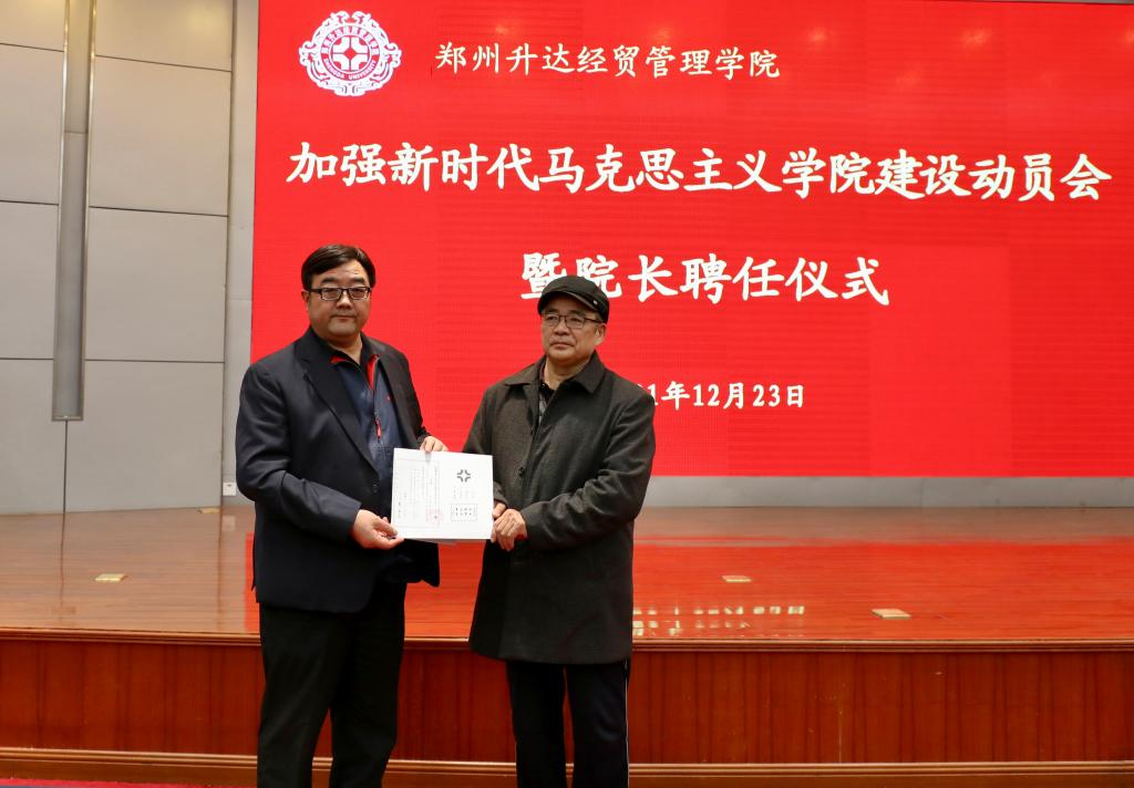 为认真贯彻落实全国全省高校思想政治工作会议精神和中共中央办公厅《关于加强新时代马克思主义学院建设的意见》,加强我校马克思主义学院建设,12月23日下午,我校在国际会议厅召开加强新时代马克思主义学院建设动员会暨院长聘任仪式。全体校领导、党委委员、董事会办公室、组织部、宣传部、教务处、学务处(学工部)、人事处(教工部)、校团委等相关部门负责人以及马克思主义学院全体专兼职教师参加会议。会议由校党委副书记、校长郭爱先主持。