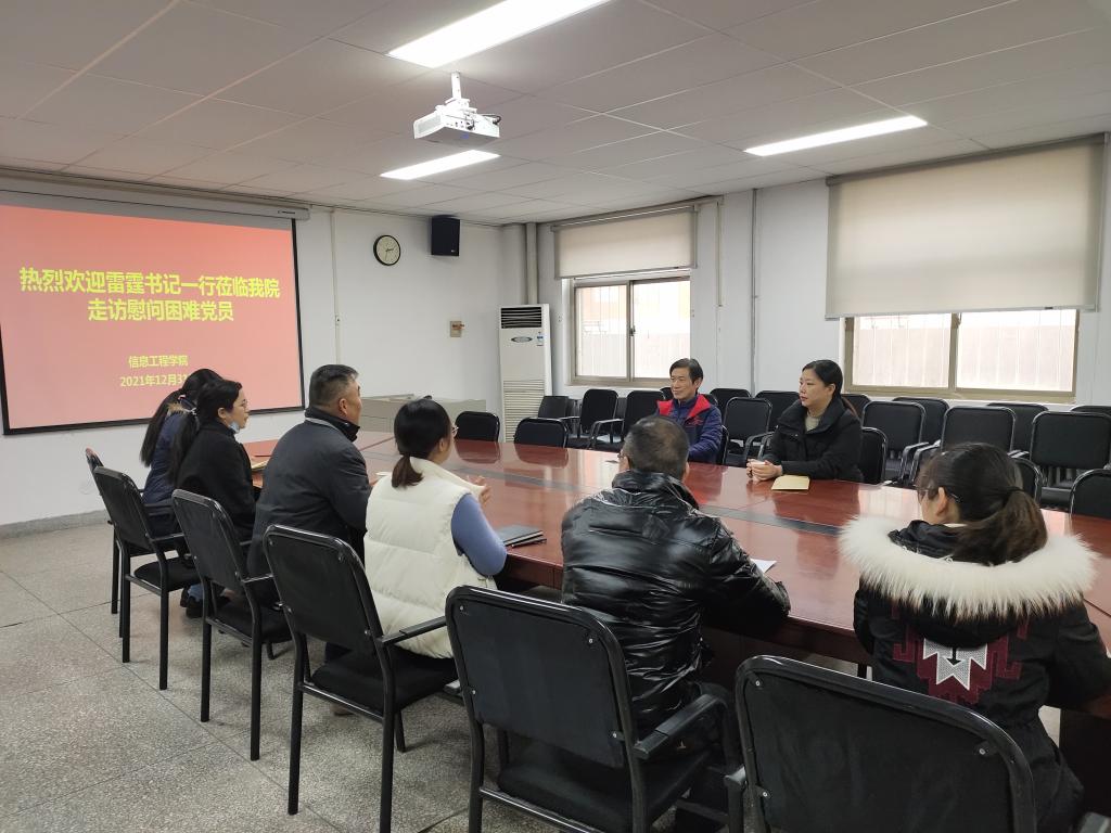 12月31日,校党委书记雷霆、党委办公室主任秦旻莅临信息工程学院,走访慰问困难党员,向学院教师党员李艳萍、史丽丽,学生党员牛啸天、张鼎送来了组织的关怀与温暖。信工学院党委书记张现水、院长白鑫,信工学院教学秘书、教师代表、辅导员代表参加活动。