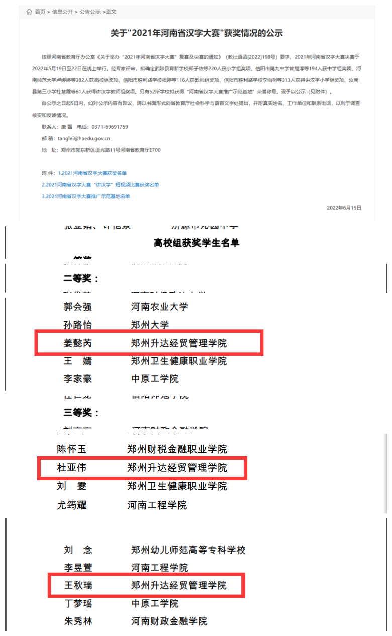 在校领导的大力支持和各部门老师的全力配合下,我校选手在实训大楼B座一楼103智慧教室准时参赛。在前期学校严格选拔赛中,4名优秀学生脱颖而出,作为参赛选手代表我校参加本届汉字大赛,他们分别是:19级汉本一班杜亚伟、20级法本一班姜懿芮、20级汉本二班刘园梦、21汉升本二班王秋瑞。5月19日,校语委办公室王松洁老师带队参加了全省汉字大赛的复赛和决赛。面对来自全省70多所高校的佼佼者,我校学生在比赛中沉着冷静、积极应答、临危不乱,充分彰显了升达学子的风姿。经过几轮激烈的角逐,最终,姜懿芮同学荣获省级二等奖,杜亚伟、王秋瑞同学荣获省级三等奖。