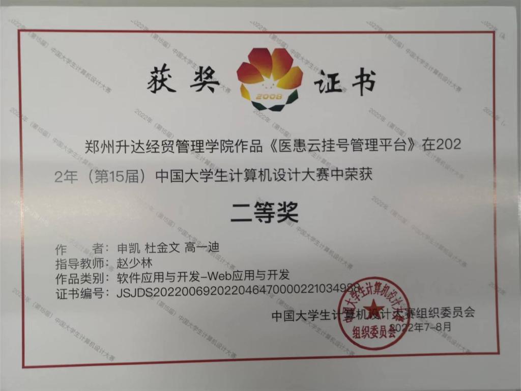 近日,2022年第15届中国大学生计算机设计大赛全国总决赛正式落下帷幕。我校信息工程学院2019级计算机科学与技术专业申凯、杜金文、高一迪三位同学的作品《医患云挂号管理平台》参加了软件应用与开发组的全国总决赛,最终获得全国二等奖1项。