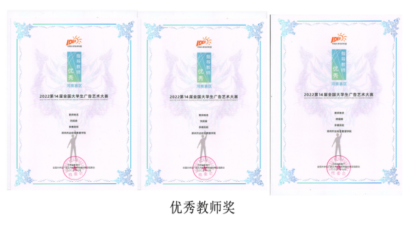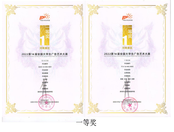 本次在比赛中,由林娅楠老师指导,单鹤、王莹、肖然、任静同学创作完成的《头等危机》斩获河南赛区策划案广告类赛道最高一等奖;由张扬老师师指导,张栋铭同学创作完成的《抵达醇真》喜获文案广告类赛道一等奖。刘成瑜、林娅楠、张扬三位老师获得“优秀指导教师”荣誉称号。