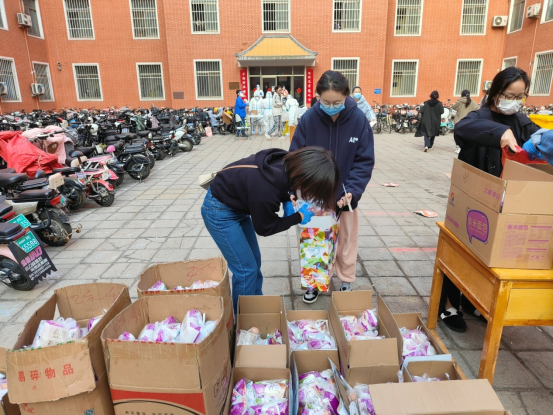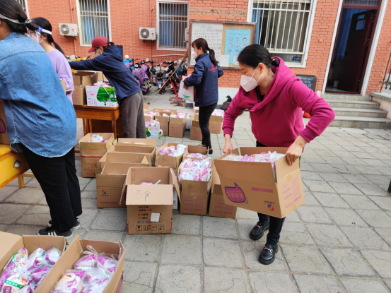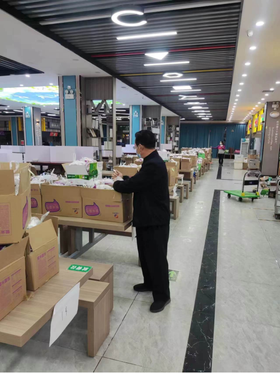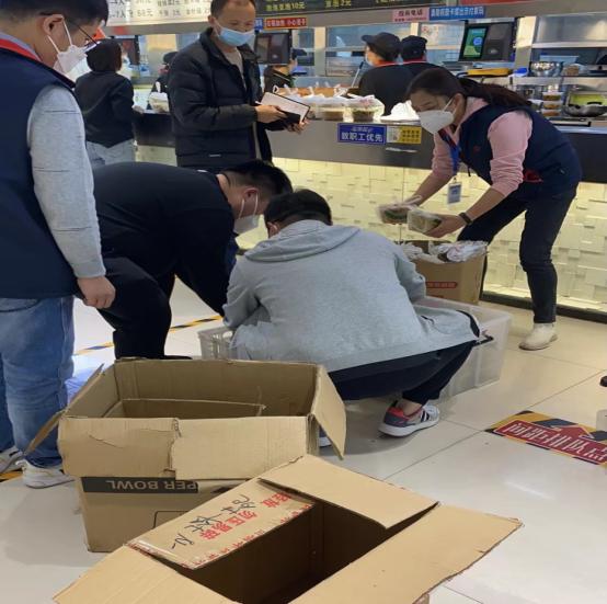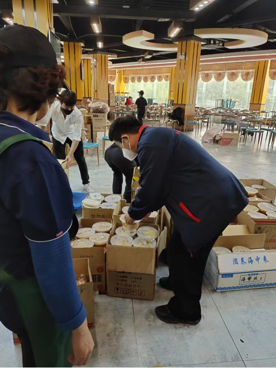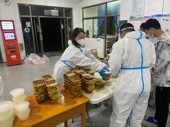 财务处郝亚利、刘芳、王春丽、张融协助信息工程学院的辅导员为25、26号楼的2000余名学生发放一日三餐。接着,为提高出餐速度,餐厅急需人手,四位志愿者又转移到龙湖食府一楼,每日早、中、晚三餐协助食堂为25、26、28、29号楼的4000余名学生进行餐食打包、配送。为保证准确统计食堂各窗口出餐量和各楼宇配餐情况,合理设计表格,考虑男女生食量不同,合理分配各宿舍楼的配餐,并且每次配餐前都要考虑上次配餐的品种,尽量搭配不同品种,让学生花样就餐,挺高学生的满意度。在食堂商户、总务处等志愿者小队的共同努力下,尽最大努力短时间内完成4栋宿舍楼的全部配餐任务让学生吃上热乎饭菜。在28号楼有疫情后,龙湖餐厅一楼配餐人员刚开始心里都比较恐慌,但考虑到“孩子总要吃饭,餐总要有人送”,立即调整心态,在大家的共同商议下指定专车、专人装箱打包为28号楼送餐,打包纸箱不再拉回餐厅,避免和25、26、29号楼交叉,每为28号楼送一趟餐回来,都要人车消毒后才能再进入餐厅拉餐,做好防疫防护工作。“先让学生吃饭”、“让学生吃好饭”是我们每位志愿者的心声,所有的苦和累在配完餐的那一刻消失殆尽。