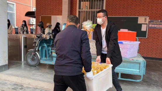 财务处张留杰自学校10月18日静默管理以来,积极报名参加学校志愿者,他与总务处的志愿者一起为1-11号学生宿舍楼及18号学生宿舍楼的数千名学生提供送餐服务。每天早上6点50分、中午11点、下午4点50分,他准时在南食堂协助餐厅工作人员将分装好的数十箱的盒饭装到电动三轮车上,然后骑车送到指定宿舍楼,与宿舍楼管理人员一同将成箱的盒饭卸车放到指定的位置,待所有餐都发到学生手中后,再骑车去将装餐的空箱子回收送至南食堂。每次都是待学生都吃上饭后,把该做的工作做好后,他才去食堂解决自己的吃饭问题。十几天以来,每天如此,每天都有数十箱的盒饭要装车、搬运、卸车,有时候感觉很累,但想想数千名学生一日三餐能得到了保障,每天都能按时吃上饭,为学校疫情防控创造了有利条件,他觉得再苦再累也是值得的!
