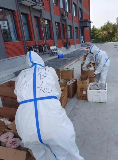 送餐时,穿着闷热的防护服穿梭在楼道间,核实饭菜数量后搬运成箱的饭菜,一层一层送餐至每个寝室门口,确保不落一人,不少一餐。时间紧,任务重,为确保学生尽快吃上热饭,顾不上自己全身湿透,两腿发软,稍作喘息便继续投入工作。送餐任务完成才敢吃饭休息。