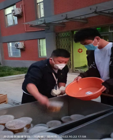 接到学校的需要封闭管期通知,图书馆杨柳老师在10月12清晨匆匆安排家里的老人孩子,就选择了住校留守,三天后学校通知特殊情况可申请返郑,作为两个孩子的妈妈,生活和工作的平衡对她来讲是个极大的挑战,这次入住校园的时间没有上限,杨柳老师一边担心两个年幼的小孩子,同时也在考虑校园里这么多的“大孩子”该怎么办?作为一名老党员,老升达人她义无反顾的选择留在这里。疫情来势汹汹,工作任务艰巨,每天清晨六点多就准备学生配餐,送餐工作,每次都是跟学生们最近距离的接触,但她从不畏惧,在每天一日三餐的送餐过程中还跟同学们讲一些防疫工作的注意事项,理性看待疫情给生活学习带来的不便!理解学校的封控制度!力求将同学们的不满情绪降到最低! 杨柳老师用实际行动诠释了一名共产党员在关键时期的使命与担当!坚信我们升达在这场防疫战斗中,一定可以胜利,升达园早日恢复到之前的神采!