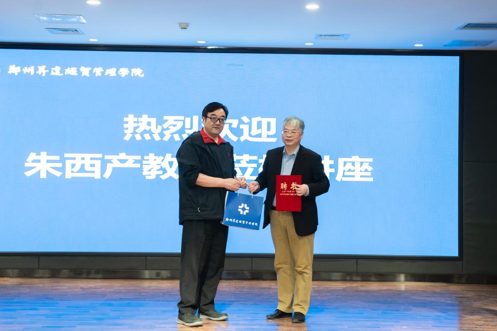 报告结束后,由王新奇董事向朱西产教授颁发了客座教授聘书,并赠送创办人王广亚文集。
