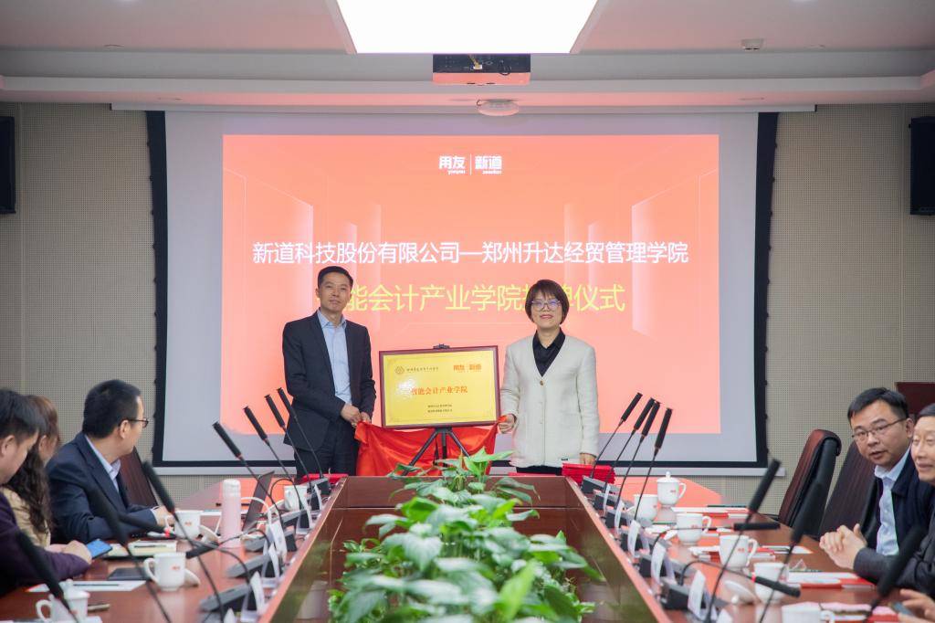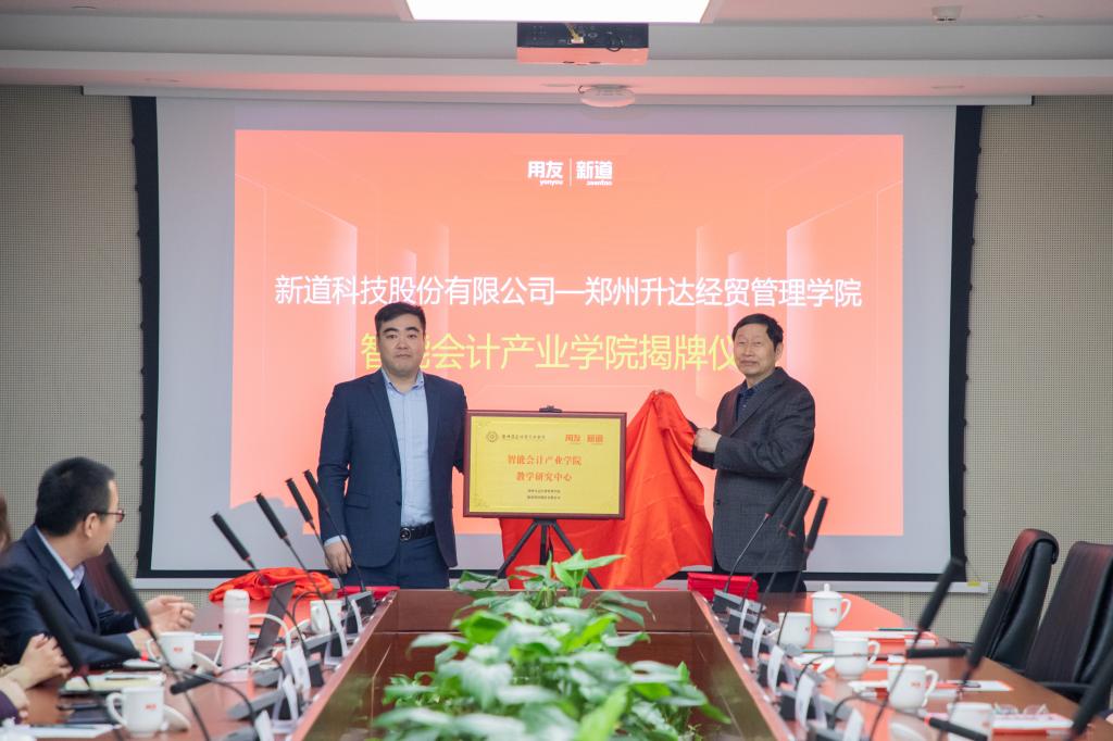4月25日,我校携手用友新道科技股份有限公司共建智能会计产业学院揭牌仪式在北京用友产业园成功举行。校长张欣、新道科技股份有限公司董事长兼总裁陈强兵、助理总裁何胜利、商业伙伴部总经理米波、河南分公司总经理郑胤、新商科高级专家刘镇、新工科高级专家侯宇坤等出席了揭牌仪式,学校教务处副处长赵悦然、实训管理处处长程敏姿、校地合作处处长冯科、会计学院院长张景空、会计学院副院长张新成、校地合作处王彦雨科长参加了仪式。