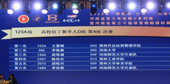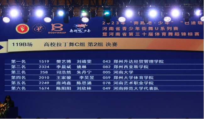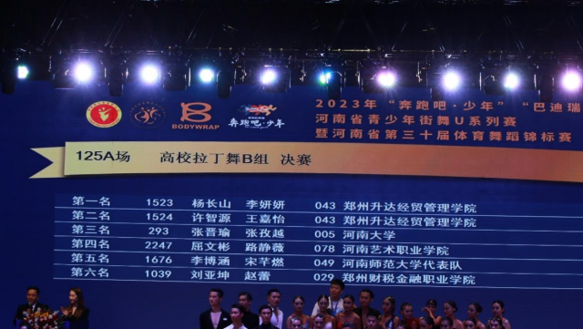 我校体育舞蹈代表队参加的高等院校组汇集了郑州大学、河南大学、河南师范大学、郑州大学体育学院、华亿体育登录、黄河科技学院、郑州工商学院、郑州西亚斯学院、河南职业艺术学院、郑州财税金融学院、洛阳职业技术学院、新乡职业技术学院等12所专业院校,竞争非常激烈,我校体育舞蹈专业学生发挥出色,通过多轮次的比拼勇夺高校专业组五项第一名。