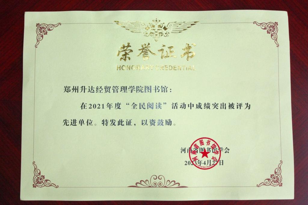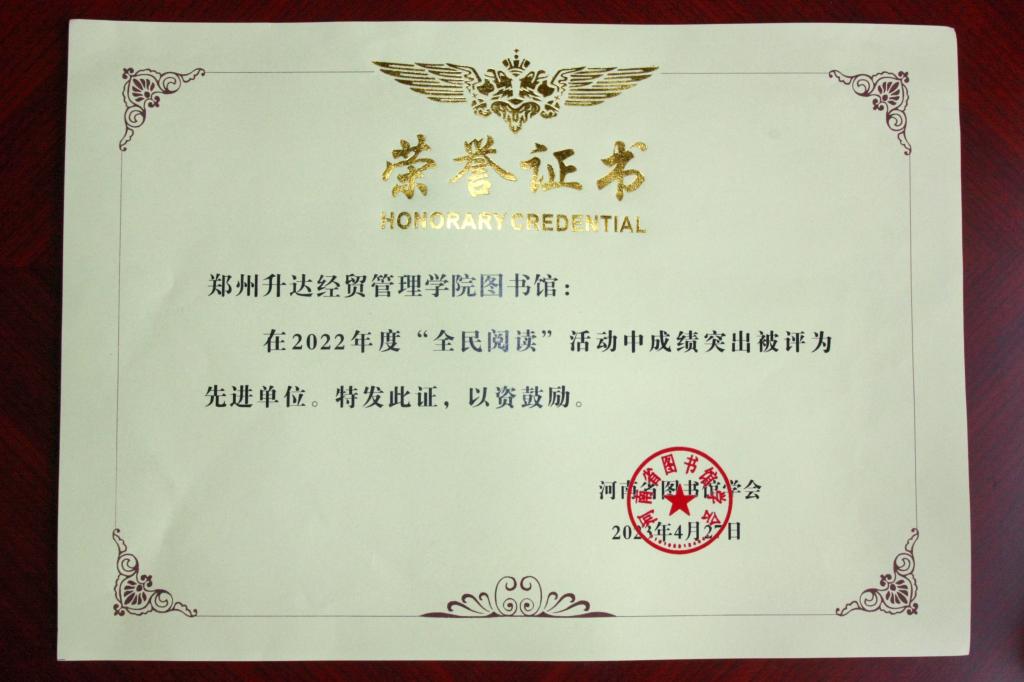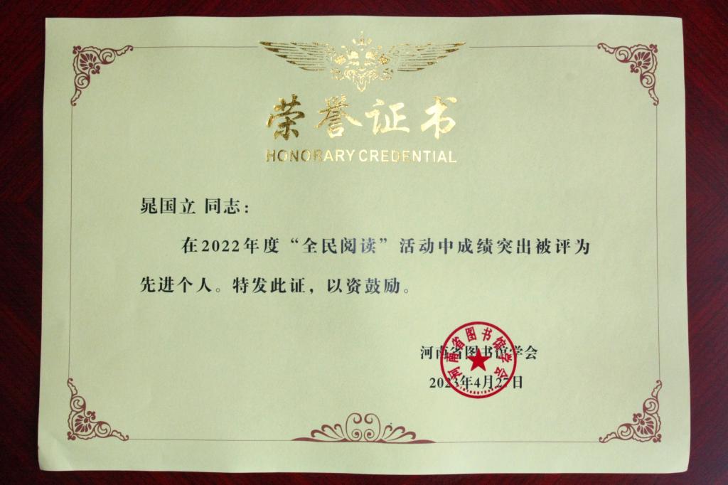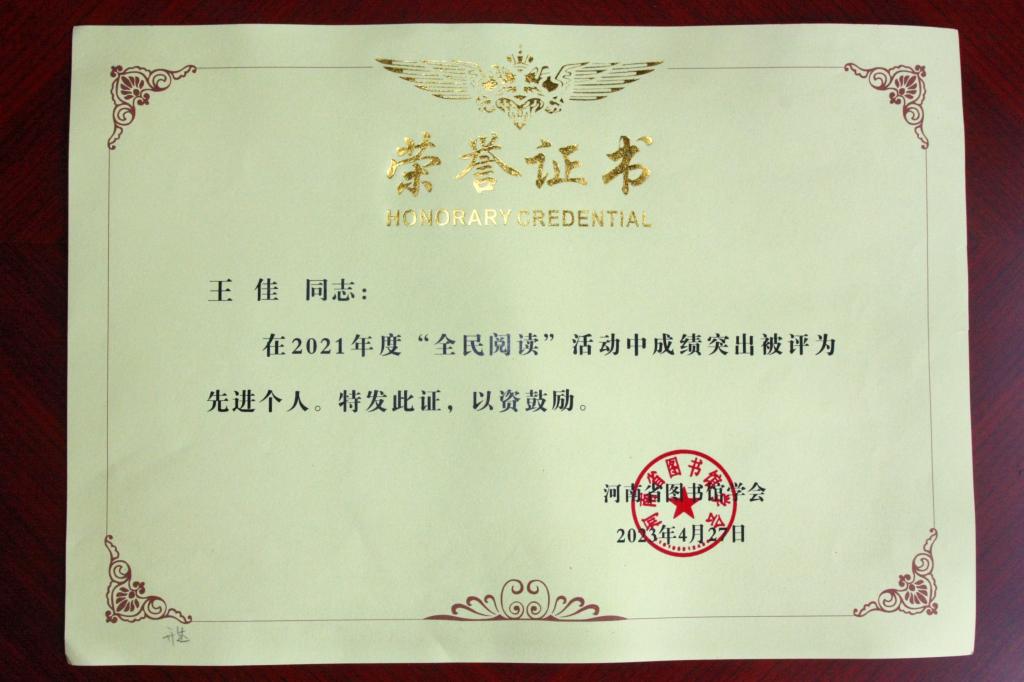 4月27日,河南省图书馆学会第十届二次全体理事会议在郑州嵩山饭店召开。这次大会分别对2021年和2022年全省各级各类图书馆全民阅读活动进行了总结和表彰。我校图书馆被评为2021年度和2022年度“全民阅读”先进单位;图书馆王佳同仁获得2021年度“全民阅读”先进个人称号,晁国立馆长获得2022年度“全民阅读”先进个人称号。