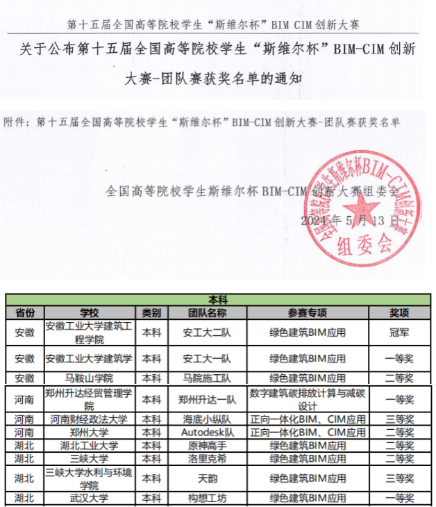 我校建筑工程学院代表队在第十五届全国高等院校学生“斯维尔杯”BIM-CIM创新大赛总决赛中取得荣获数字建筑碳排放计算与减碳设计专项一等奖。