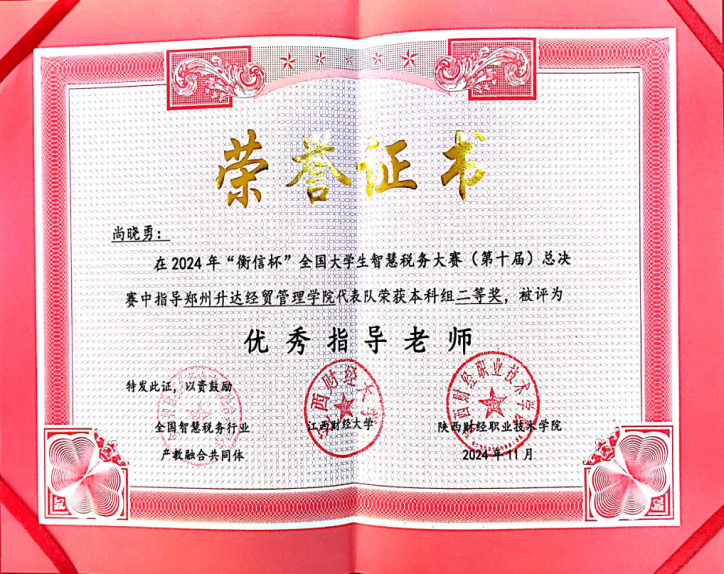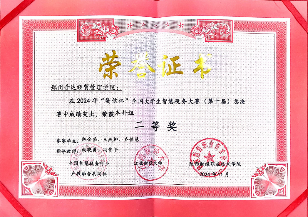 近日,第十届“衡信杯”全国大学生智慧税务大赛总决赛成功举办。共有来自全国145所院校的167支代表队501名财税精英学子参加总决赛。经过角逐,我校会计学院陈金茹、王燕柳、齐佳慧3位学生组成的代表队最终获二等奖,尚晓勇、冯伟平两位老师被评为优秀指导老师。