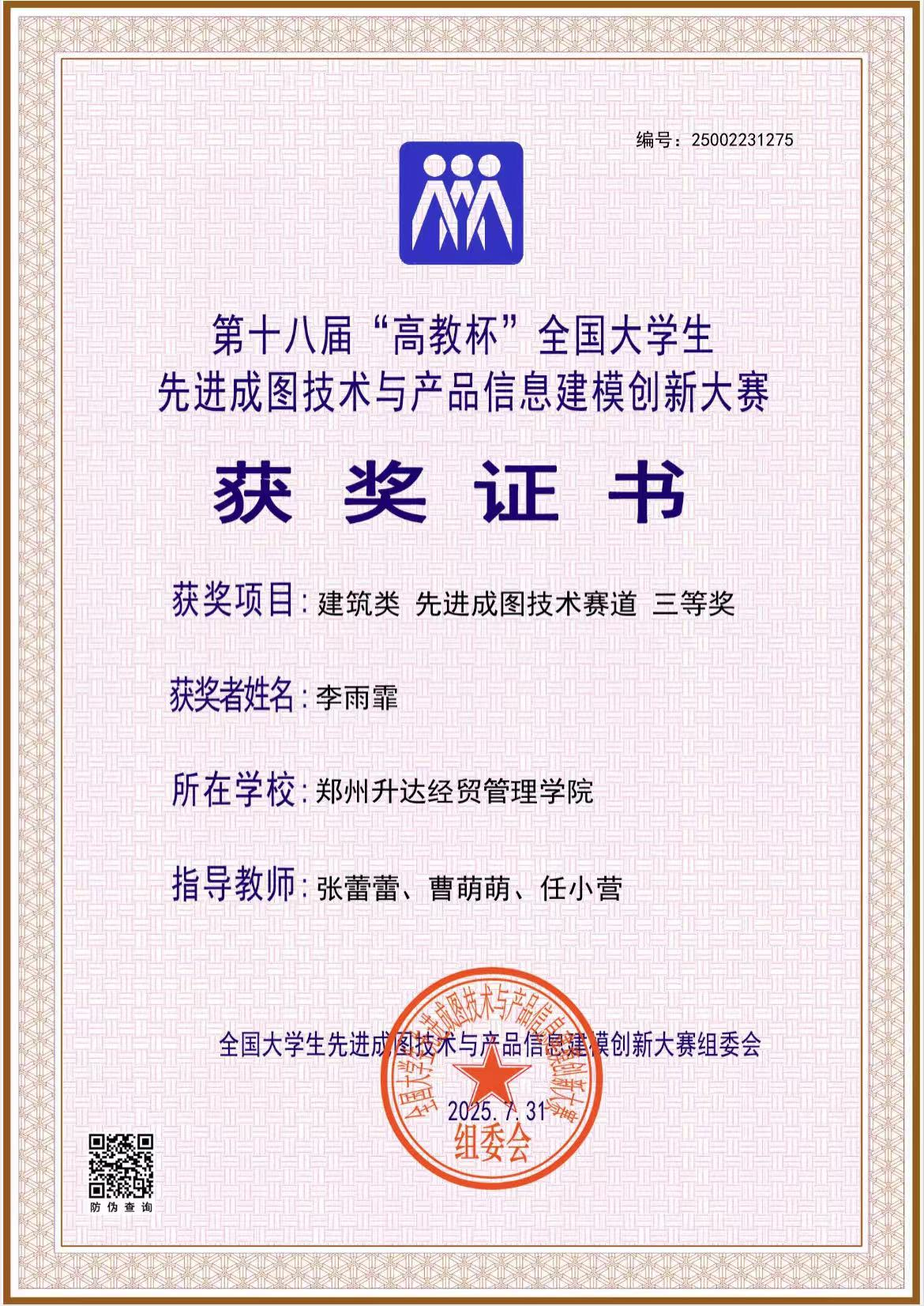 近日,第十八届全国大学生先进成图技术和产品信息建模创新大赛在太原理工大学举行,全国有1001所学校约15500余人参加了全国总决赛。1001所学校中,985院校27所,211院校73所,双一流院校84所。我校建筑工程学院委派曹萌萌老师、张蕾蕾老师带队,由2021级、2022级建筑学专业学生郭兵,梁玉锋,李雨霏,田尧中,于腾飞五位同学代表学院参加。经过一番努力,最终李雨霏同学荣获先进成图技术赛道个人三等奖。