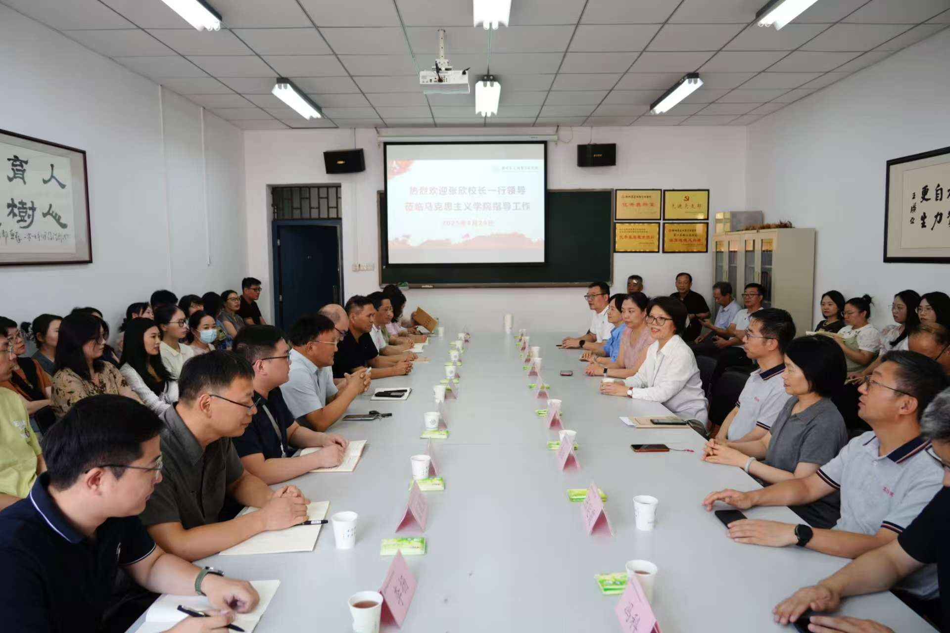 2025年8月29日下午,校长、党委副书记张欣带领相关职能部门负责人莅临马克思主义学院调研指导工作。马克思主义学院领导班子成员及全体教师参加座谈会,会议由院长程明欣主持。