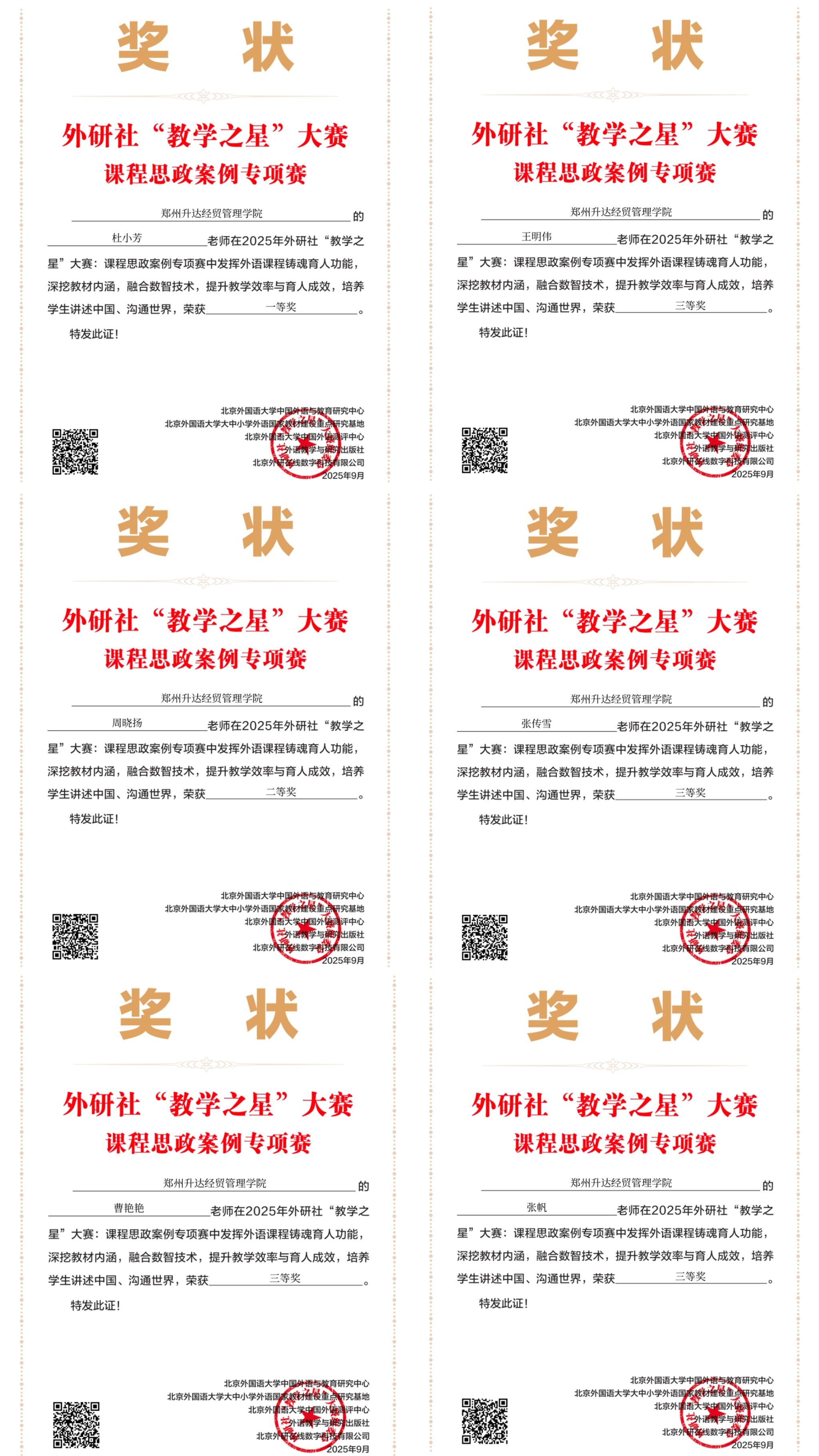 近日,2025年外研社“教学之星”大赛:课程思政案例专项赛结果揭晓,其中我校外国语学院杜小芳老师荣获一等奖,周晓扬老师获二等奖,曹艳艳老师、王明伟老师、张传雪和张帆荣获三等奖,为学院及学校赢得了荣誉。