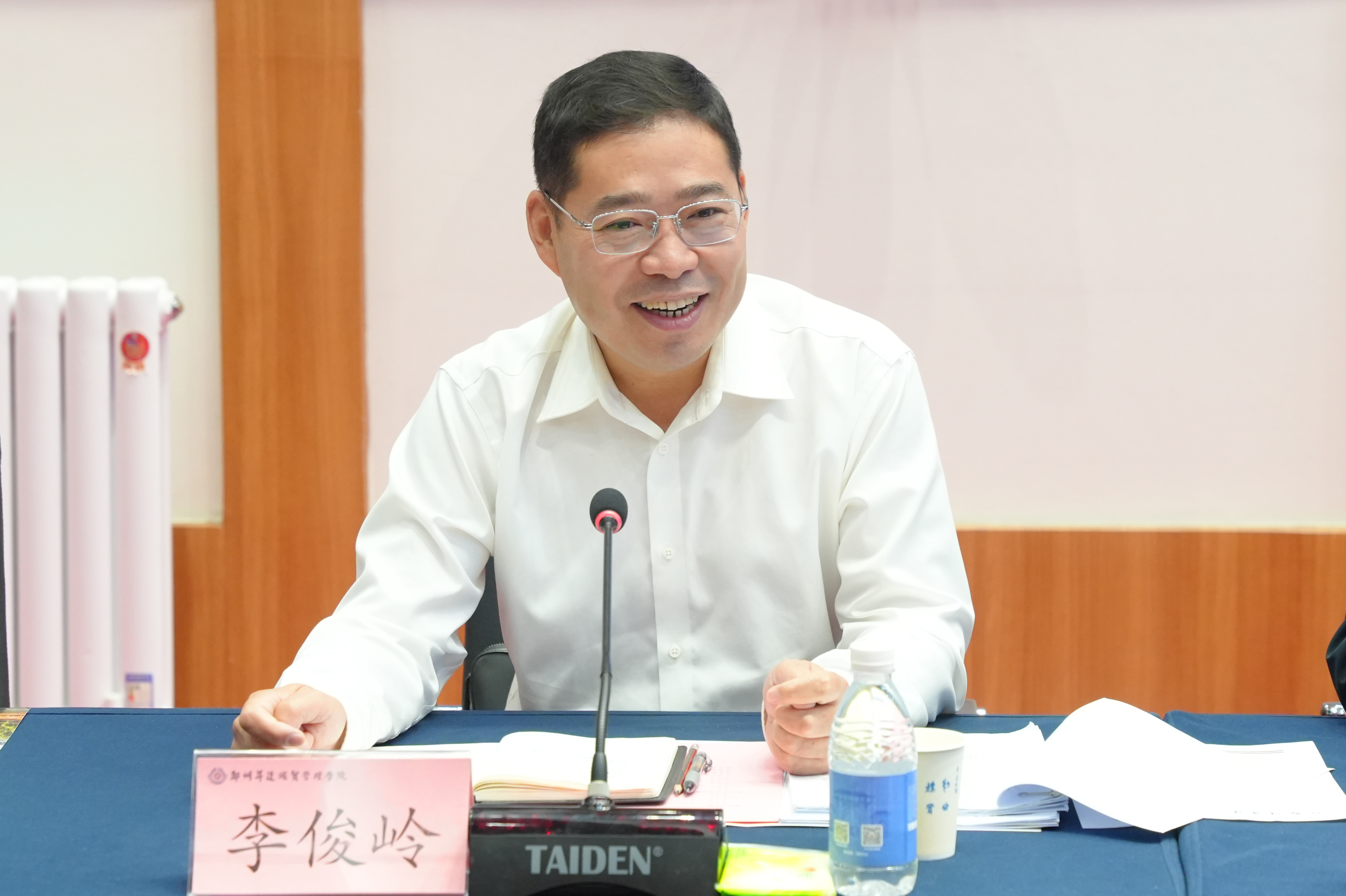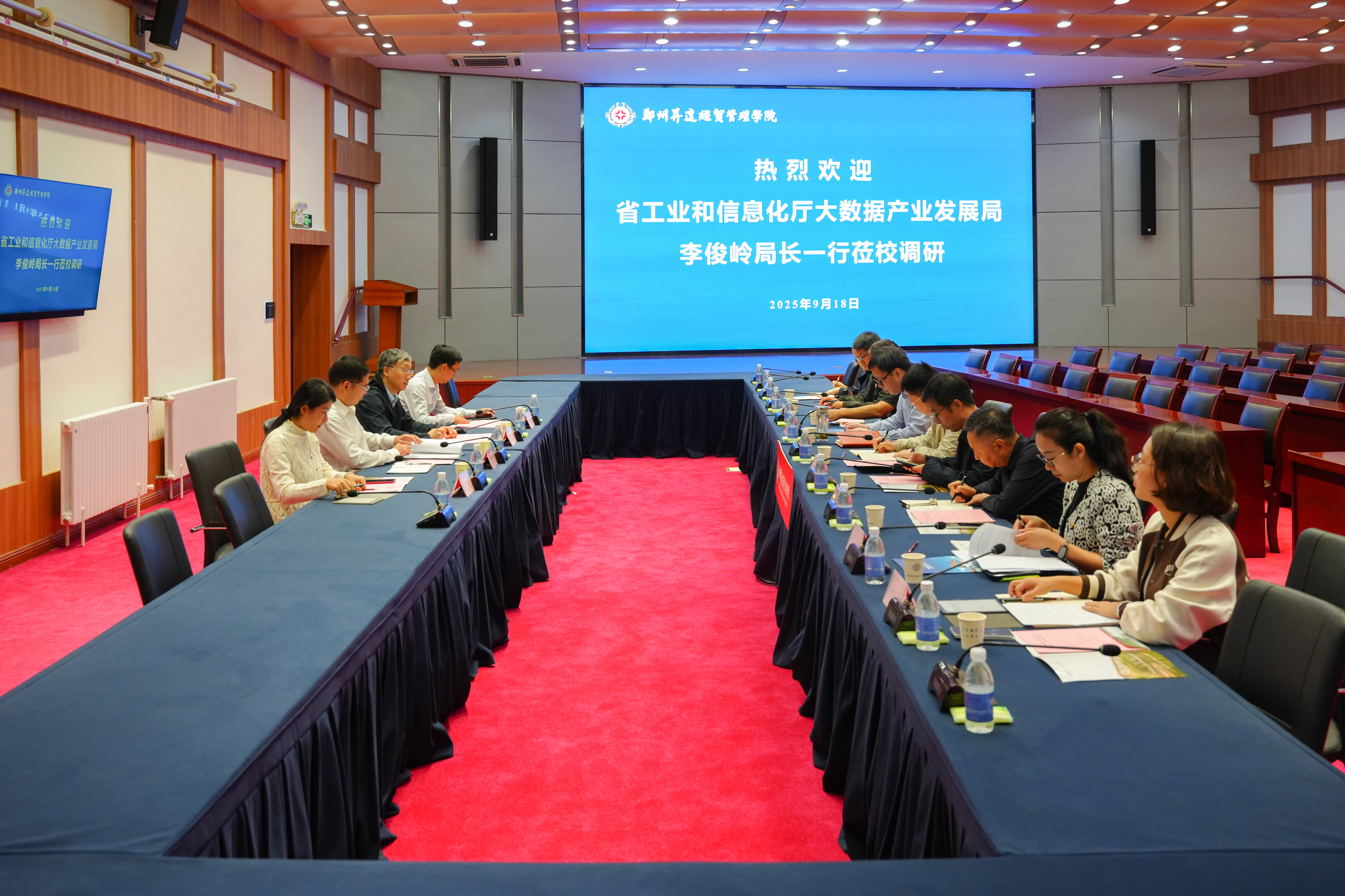 9月18日上午,河南省工业和信息化厅大数据产业发展局局长李俊岭一行莅临我校调研指导。调研座谈会在学校国际会议厅举行,河南省工业和信息化厅大数据产业发展局局长李俊岭、副局长王文龙、干部毛平,郑州数据交易中心有限公司总经理潘新民,党委委员、副校长张其武等校领导以及相关部门主管、学院院长参加会议。