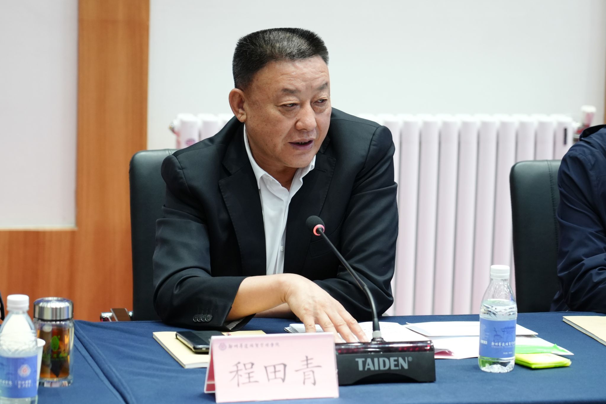 程田青董事长致辞。他简要介绍了山西中德投资集团的基本情况及发展规模,分享了自己的创业经历、企业人才培养理念,强调了持续学习的重要性。他表示,企业和高校合作意义重大,希望双方在人才培养上深度携手。高校提供前沿理论与优质生源,企业给予实践平台与行业经验,共同打造契合需求的人才,实现产学研无缝对接,共促发展!