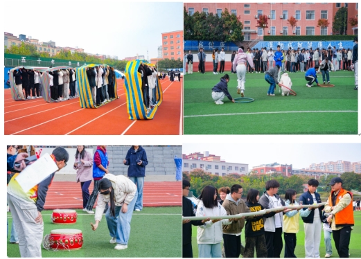 本次活动由我校主办,体育学院承办,各行政部门协办,1000余名运动员参加,旨在丰富学生文体生活、强化团队意识,提升凝聚力与执行力,为同学们搭建高效沟通交流的平台,吸引了各院学生积极参与。运动会共设置“青蛙跳荷叶”“指压板两人三足”“企鹅漫步”“无敌风火轮”“击鼓颠球”“8字绕环跳大绳”等八大趣味项目,每个项目既是对体力与智慧的双重考验,更是团队协作能力的实战比拼。赛场上,参赛同学激情饱满、全神贯注,以默契配合全力以赴;赛场边,观众助威声、呐喊声与欢呼声交织,回荡在比赛场地上空,欢乐与热血的氛围感染全场。