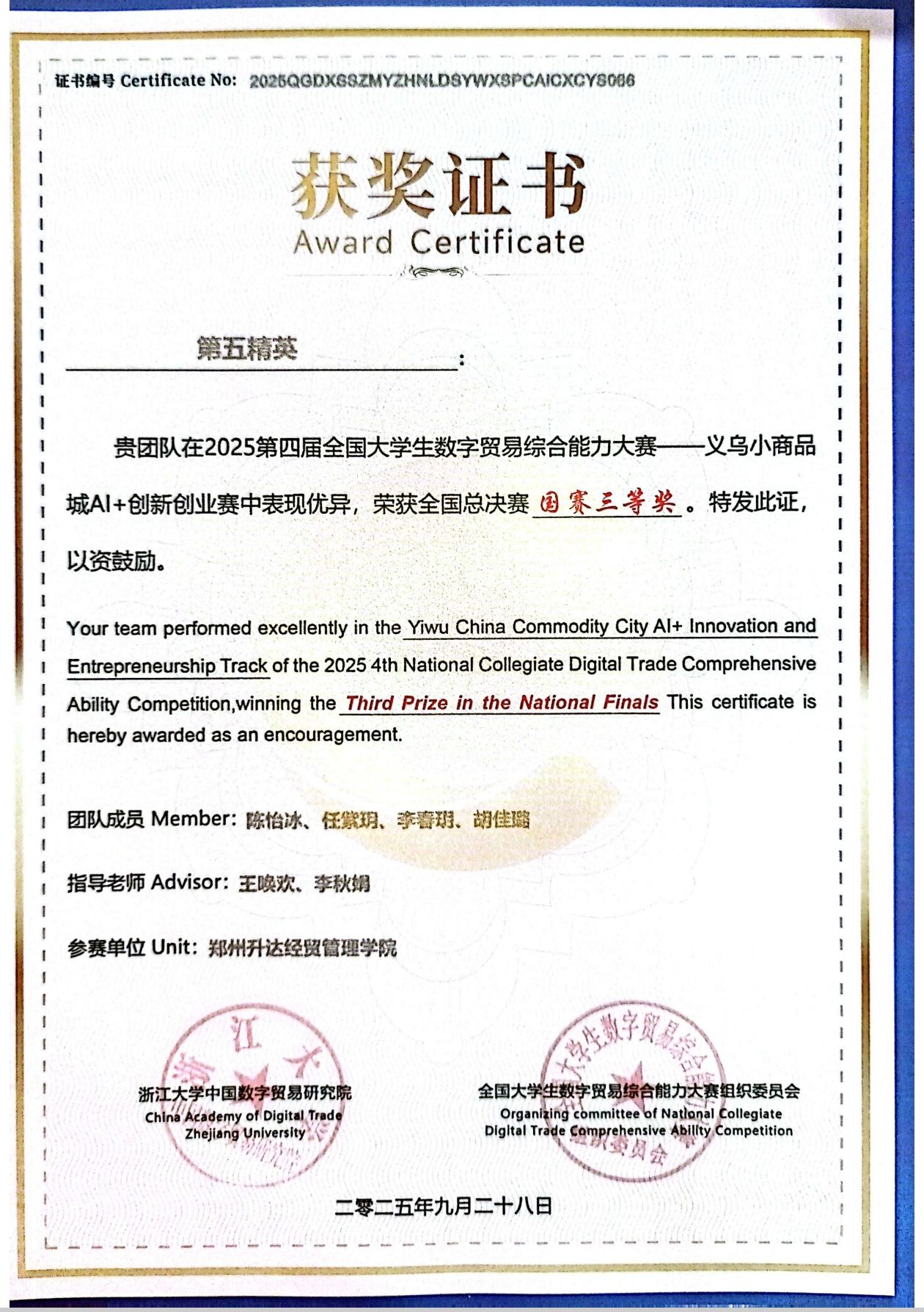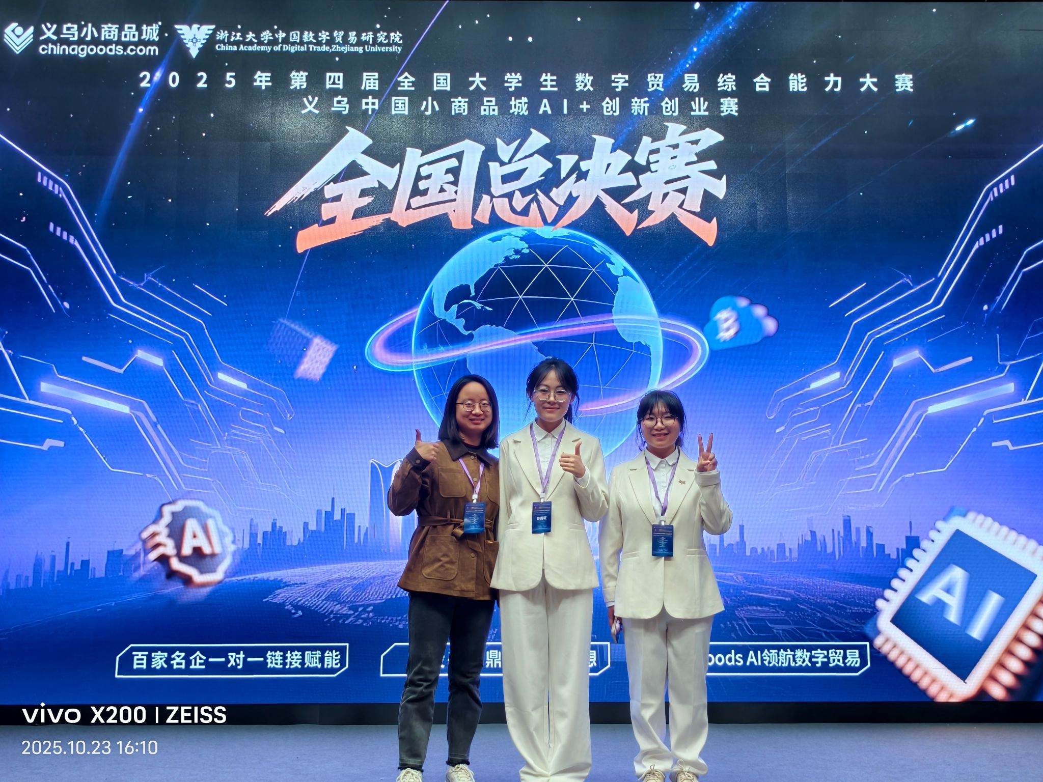 近日,第四届全国大学生数字贸易综合能力大赛-义乌小商品AI+创新创业赛道全国总决赛在浙江义乌落下帷幕。在王唤欢、李秋娟两位老师的指导下,我校金融贸易学院国际经济与贸易专业大二学生陈怡冰、任紫玥、李春玥、胡佳璐同学组成的第五精英队荣获国赛三等奖。