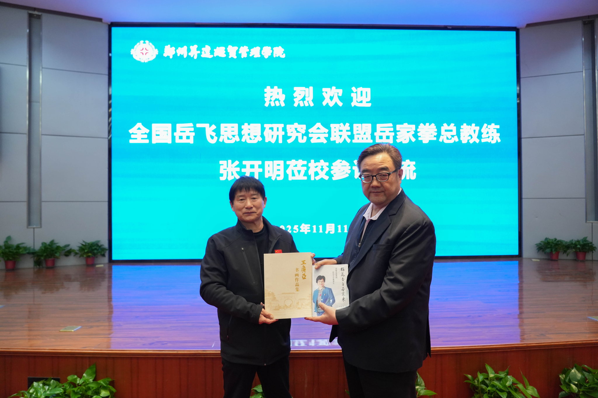 2025年11月11日上午,全国岳飞思想研究会联盟岳家拳总教练张开明先生一行莅临我校参访交流。活动在行政楼国际会议厅举行,学校董事长王新奇博士,党委副书记、副校长张金安,登封校区党工委书记沈定军及部分主管共同出席。会议由校地合作处处长王彦雨主持。