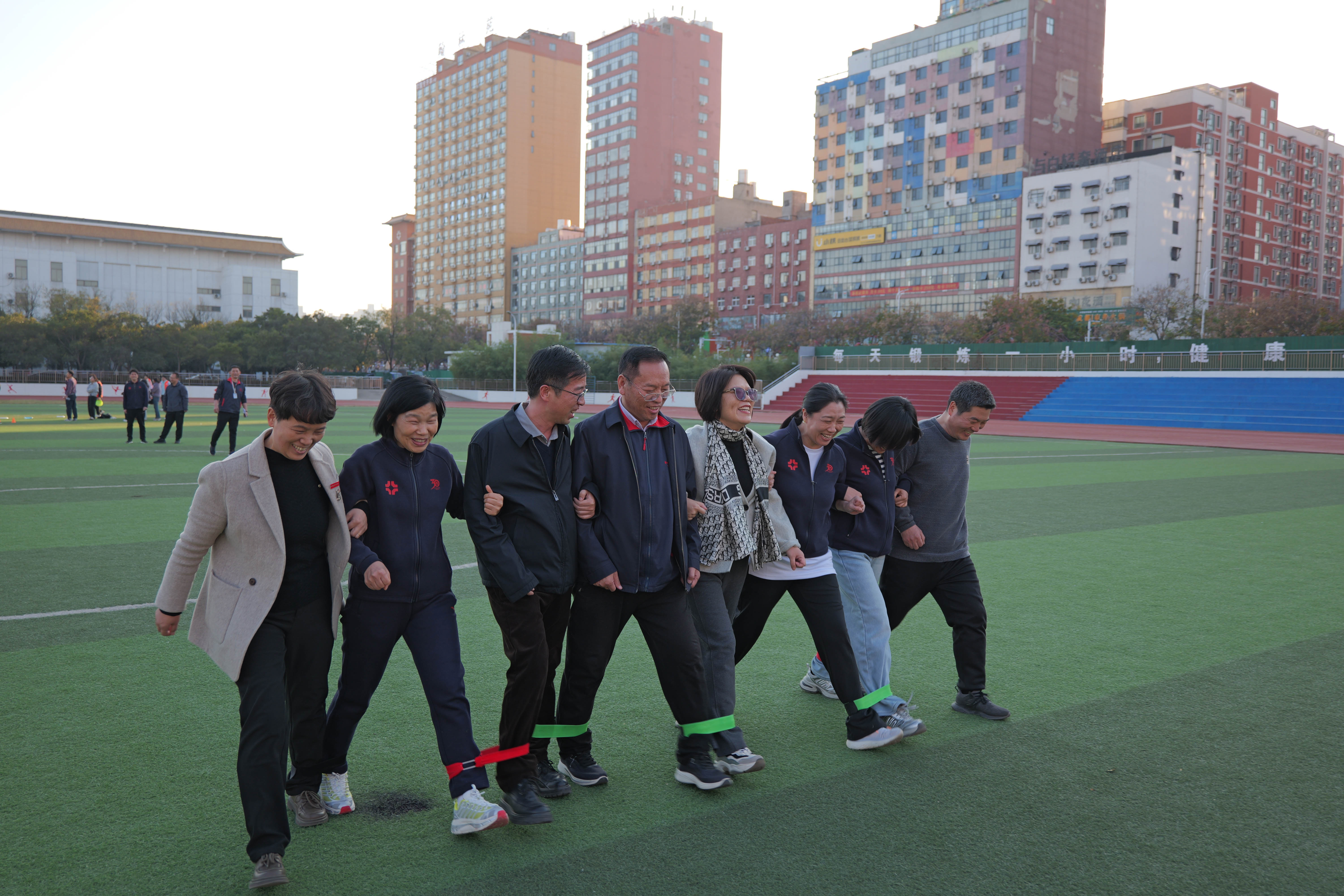决赛当天,校长张欣教授,校工会主席、运动会组委会主任张金安,副校长张其武,校工会副主席郝艳海、王新平,体育学院院长张王利、体育学院党委书记韩炎涛等领导亲临现场指导,亲身参与趣味项目体验,与教职工们同场竞技,在“同心鼓”“十人九足”等项目中并肩协作,现场氛围热烈融洽。