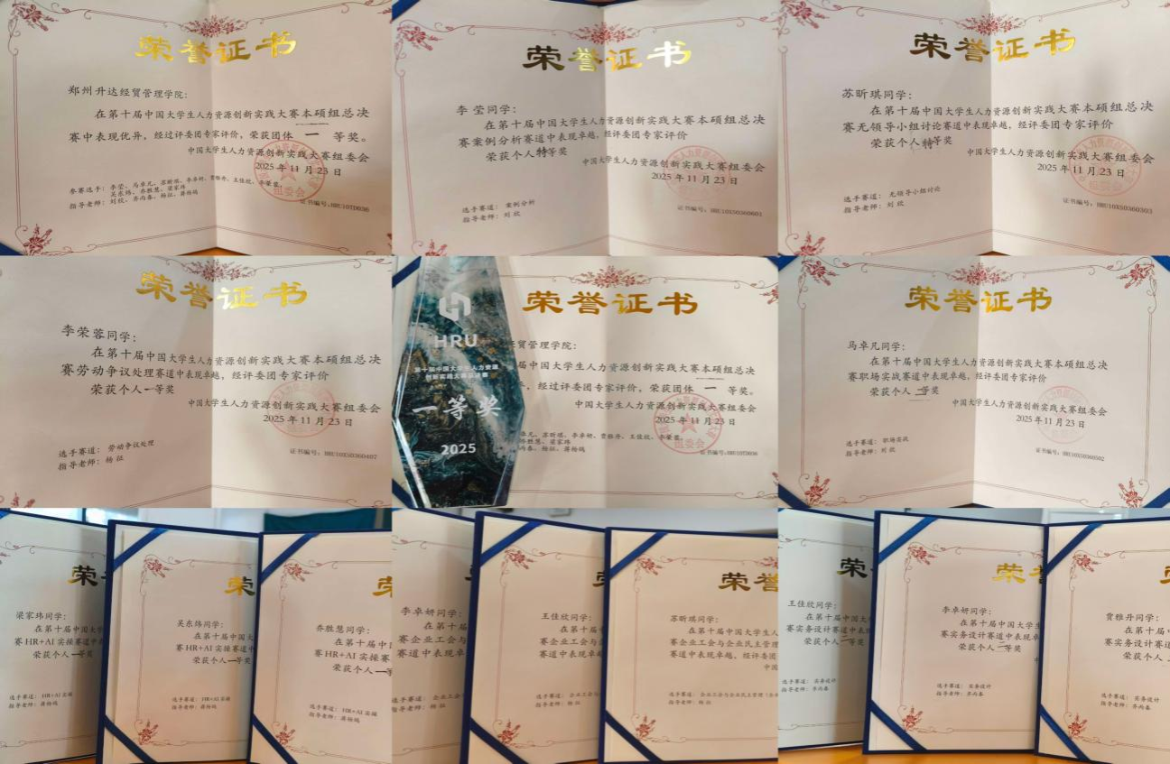 近日,第十届中国大学生人力资源创新实践全国总决赛在北京成功举办,来自全国六大赛区的100所高校,1000余位选手展开同台竞技。我校管理学院刘欣、齐丙春、杨征、蒋杨鸽四位老师指导的10名学子代表我校参加总决赛,经过为期两天的激烈角逐,荣获全国总决赛团体一等奖。其中案例分析、无领导小组讨论获特等奖,HR+AI实操、劳动争议、企业工会与民主管理赛道荣获一等奖,职场实战、实务设计赛道获二等奖。