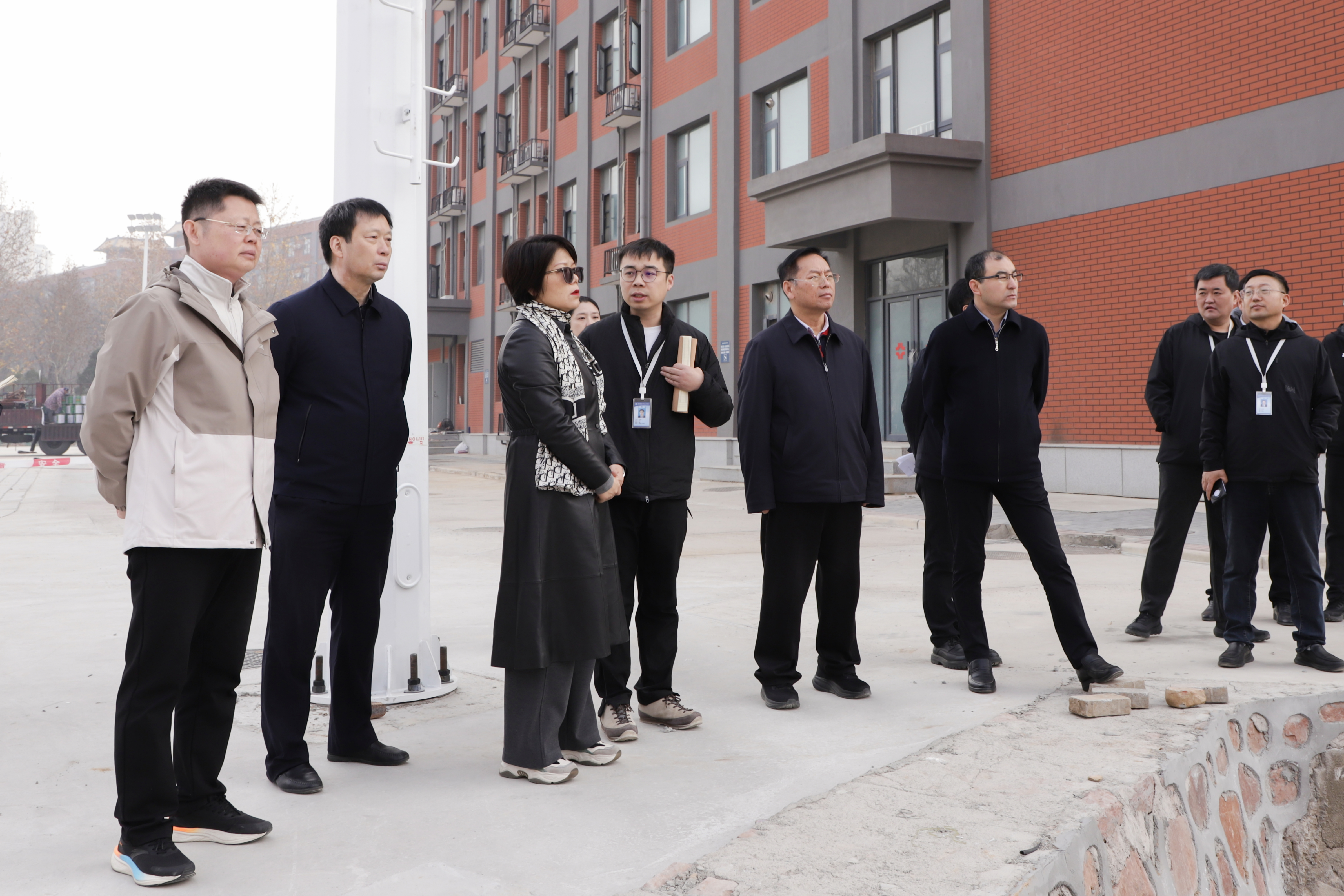 在建筑工地,检查组详细询问施工进度与安全措施落实情况,并指出施工单位要严格落实安全生产责任制,务必加强现场管理,确保施工期间校园秩序与人员安全。