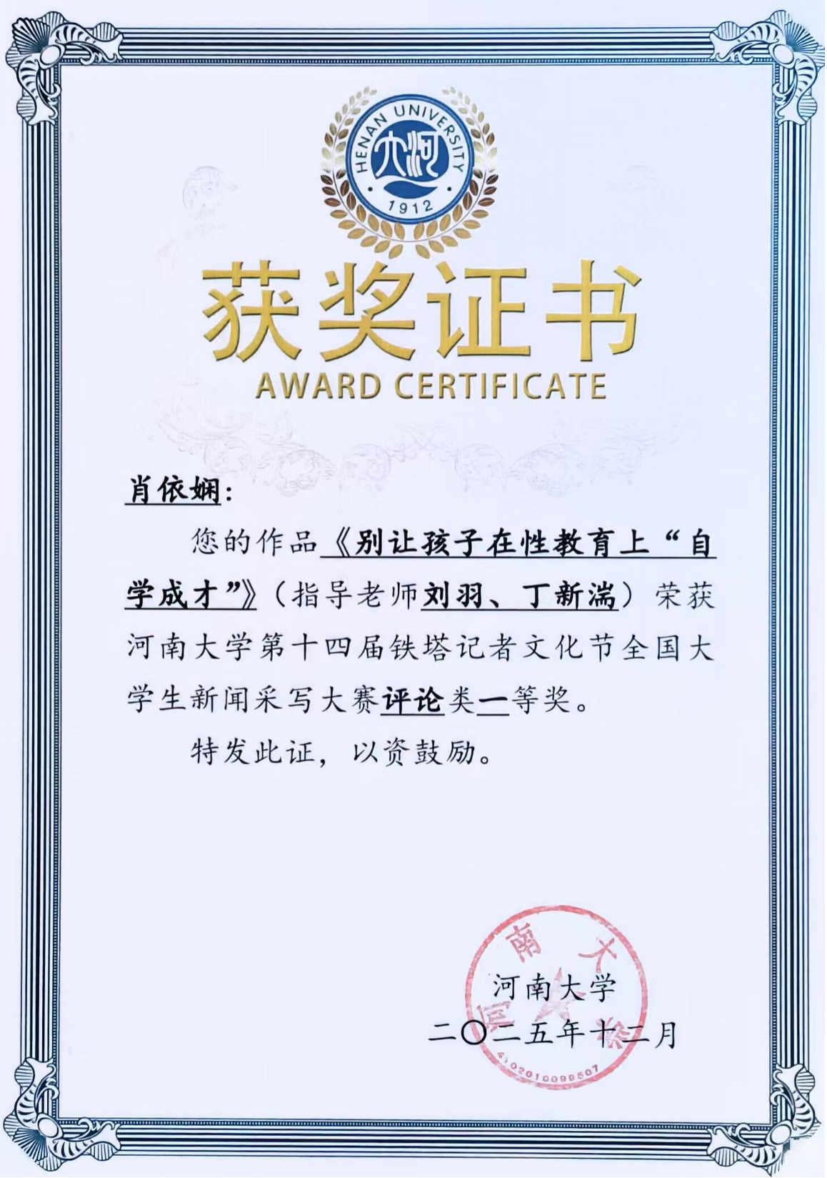 荣获一等奖的作品来自于新闻学专业的同学。2022级新闻学专业学生肖依娴的作品《别让孩子在性教育上“自学成才”》荣获评论类一等奖,李菲阳、朱雨晴、晏妞妞的作品《绞胎瓷韵,非遗传承——解锁绞胎瓷制作的千年密码》融媒体类一等奖;2023级新闻学专业学生张佳怡、马思琦、韩亿晨的作品《医美幻象下的真实困境看似理想的美,是救赎还是束缚?》和张秋粉、刘子豪、赵俊青的作品《打破就业困局:医专生在迷雾中寻求希望》荣获通讯类一等奖。