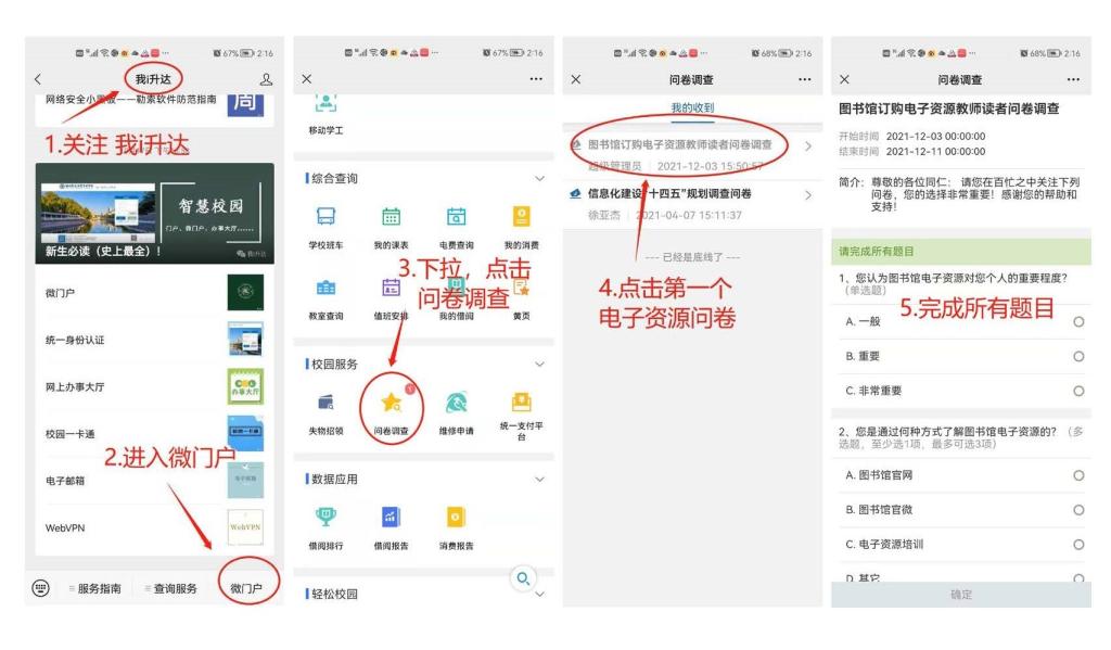 关注“我i升达”→微门户→校园服务→问卷调查→图书馆订购电子资源教师读者问卷调查