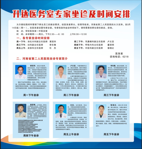 为满足校园闭环管理下师生员工的就诊需求,经前期积极筹划和准备,校领导批准,学校聘请河南省第二人民医院现任主任专家兼职我校医务室医师,开启专家坐诊长效机制。