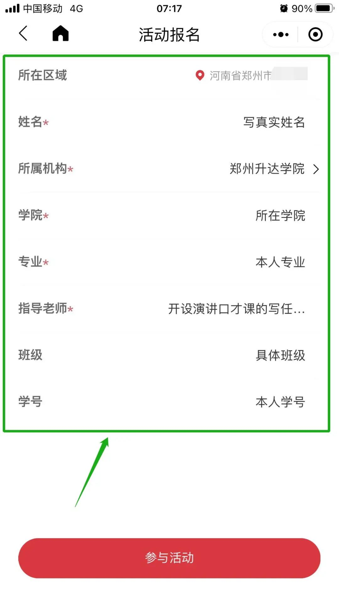 4.填写报名信息:根据活动界面要求填写真实的报名信息,请准确选择“升达学院”。如需改动,在“我的参赛”处支持修改一次。