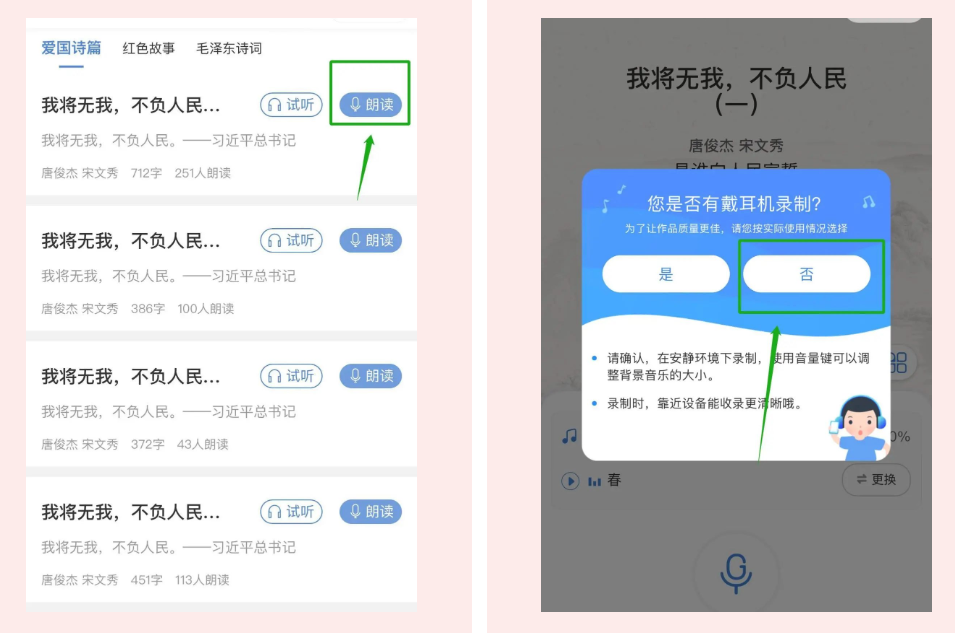 6.朗读录制:选好篇目,根据提示操作。耳机对音乐和人声音量有影响,推荐在安静环境录制,可不使用耳机。