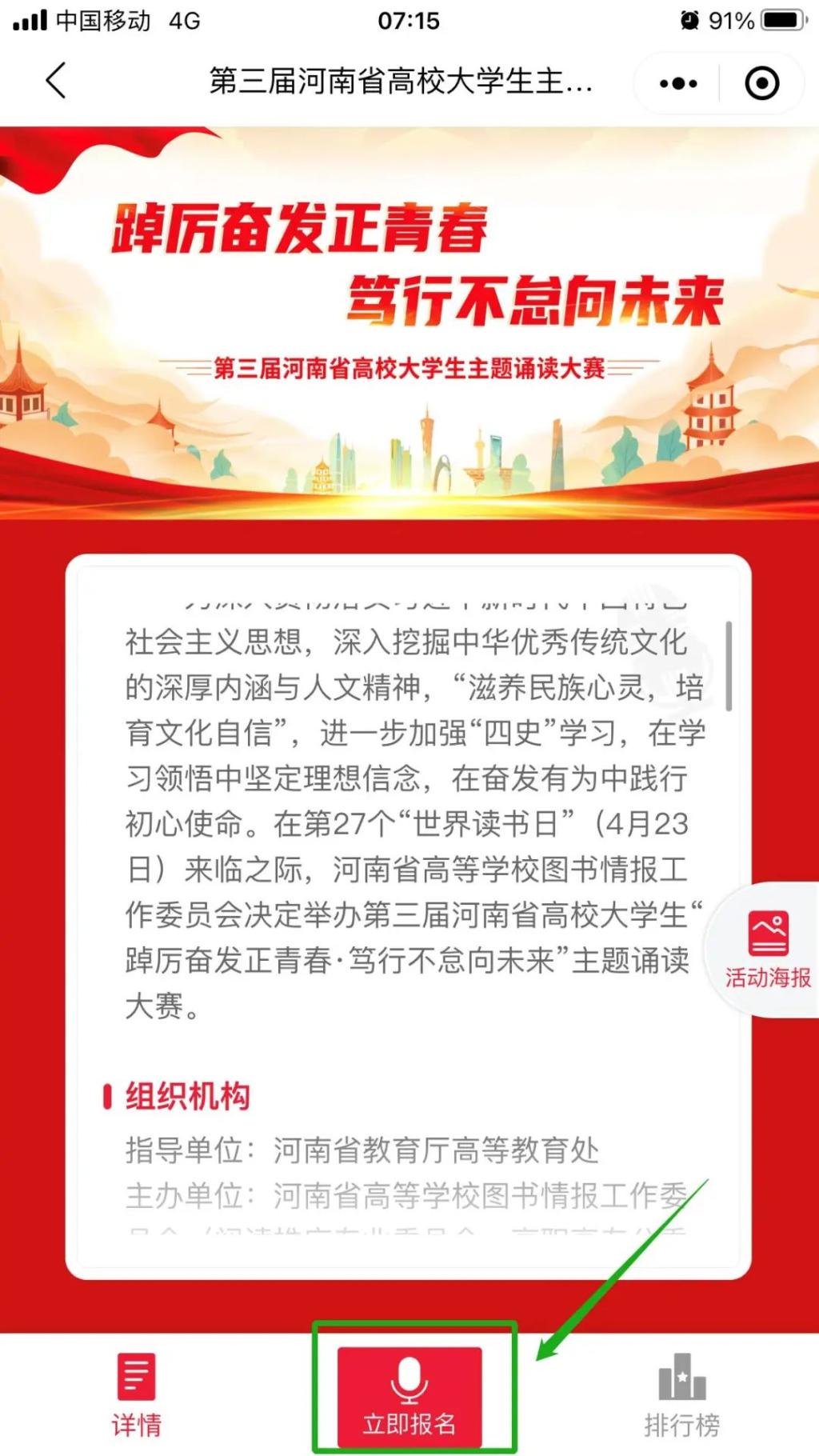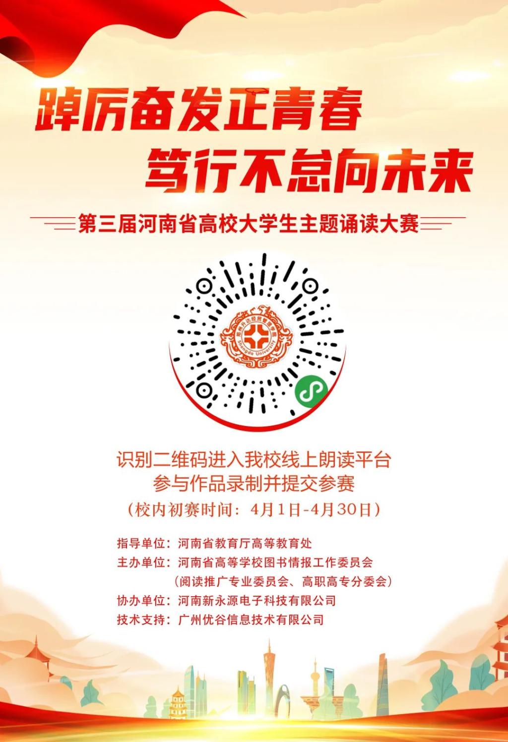 在第27个“世界读书日”(4月23日)来临之际,由河南省教育厅高等教育处指导、河南省高等学校图书情报工作委员会(阅读推广专业委员会、高职高专分委会)主办的第三届河南省高校大学生“踔厉奋发正青春·笃行不怠向未来”主题诵读大赛于近日拉开帷幕。