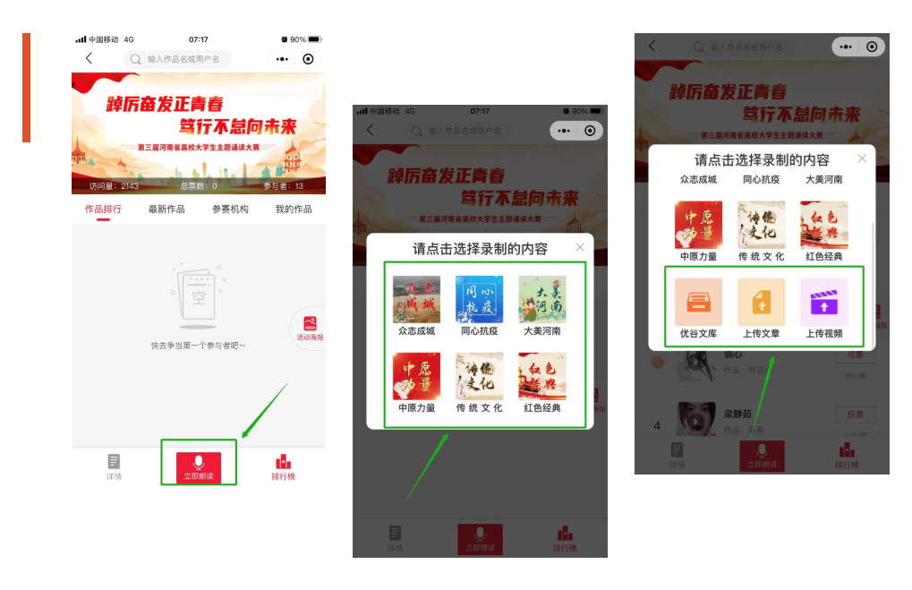 5.作品录制:点击立即朗读,围绕“踔厉奋发正青春·笃行不怠向未来”,可选择【众志成城】【同心抗疫】【大美河南】【中原力量】【传统文化】【红色经典】模块中的素材完成配乐朗读;也可点击【优谷文库】回素材库选合适素材;还可选择【上传文章】自主上传素材朗读,鼓励原创哦!